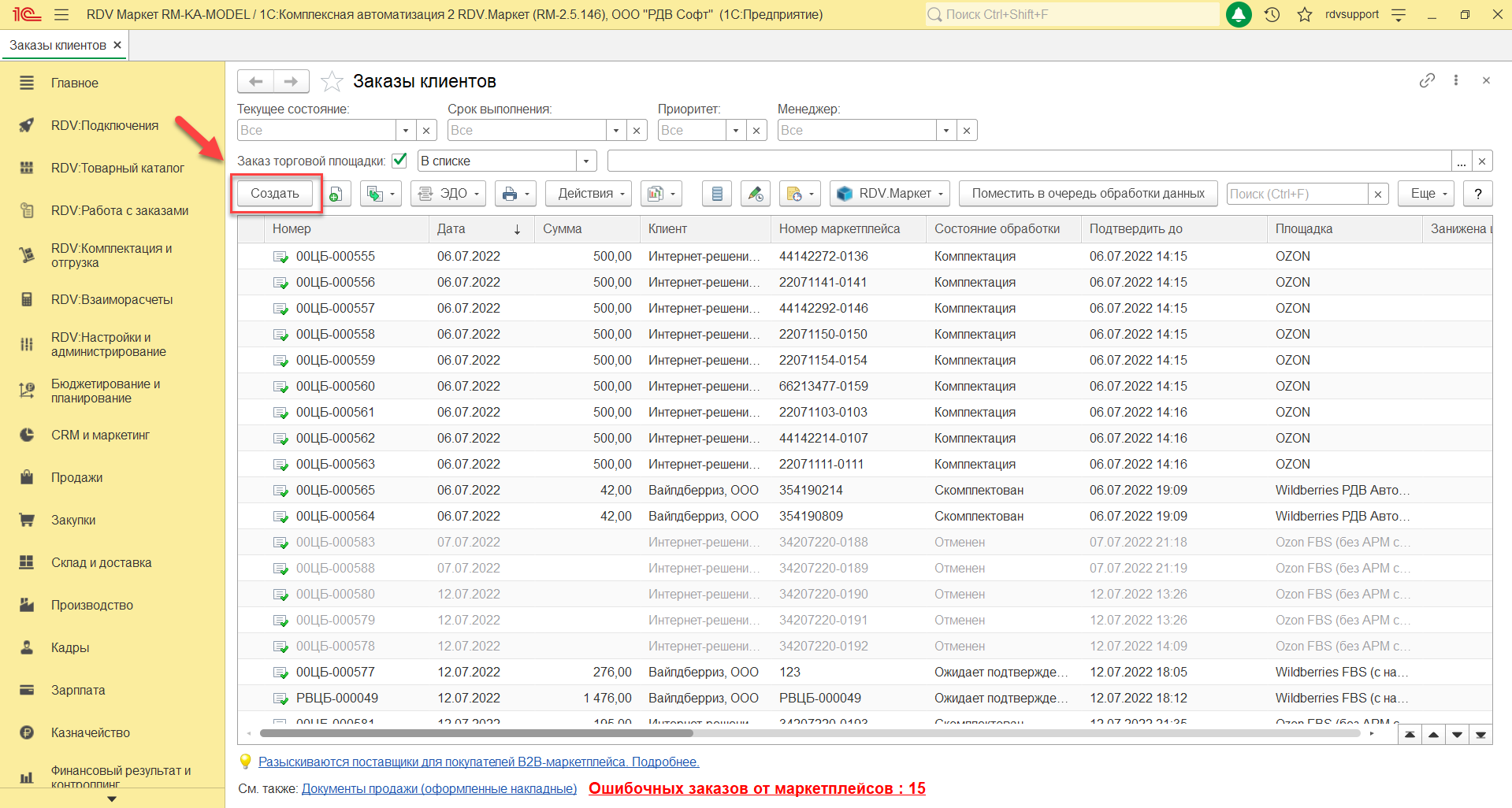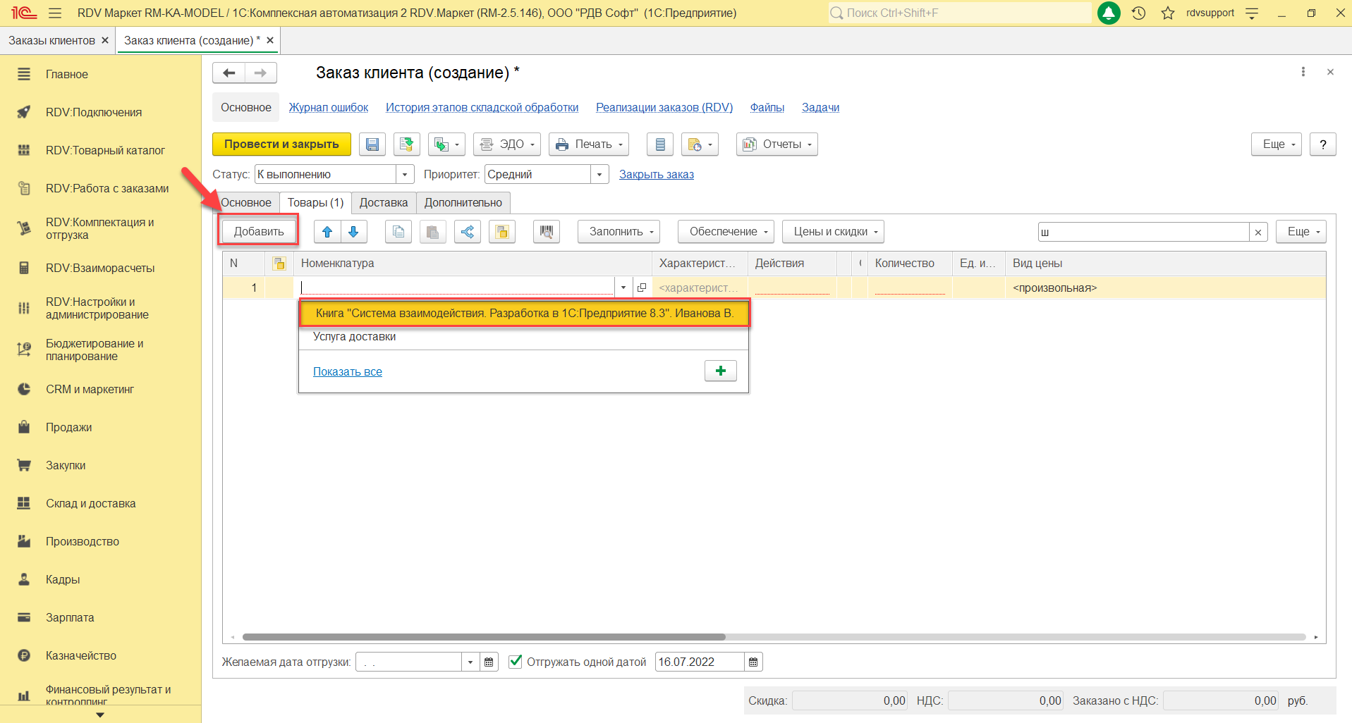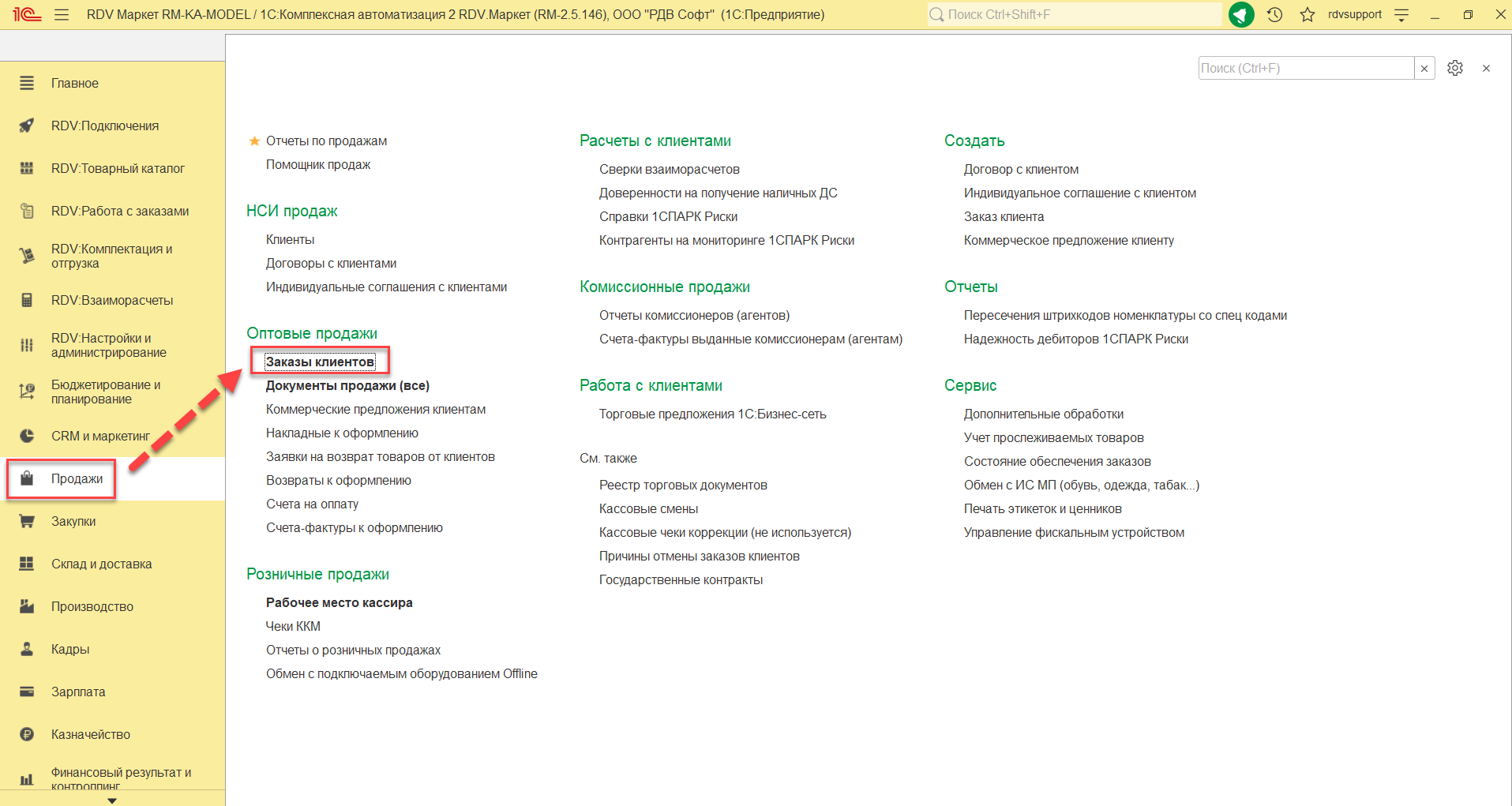 Для создания заказа клиента необходимо перейти в раздел: "Продажи" – "Заказы клиентов":