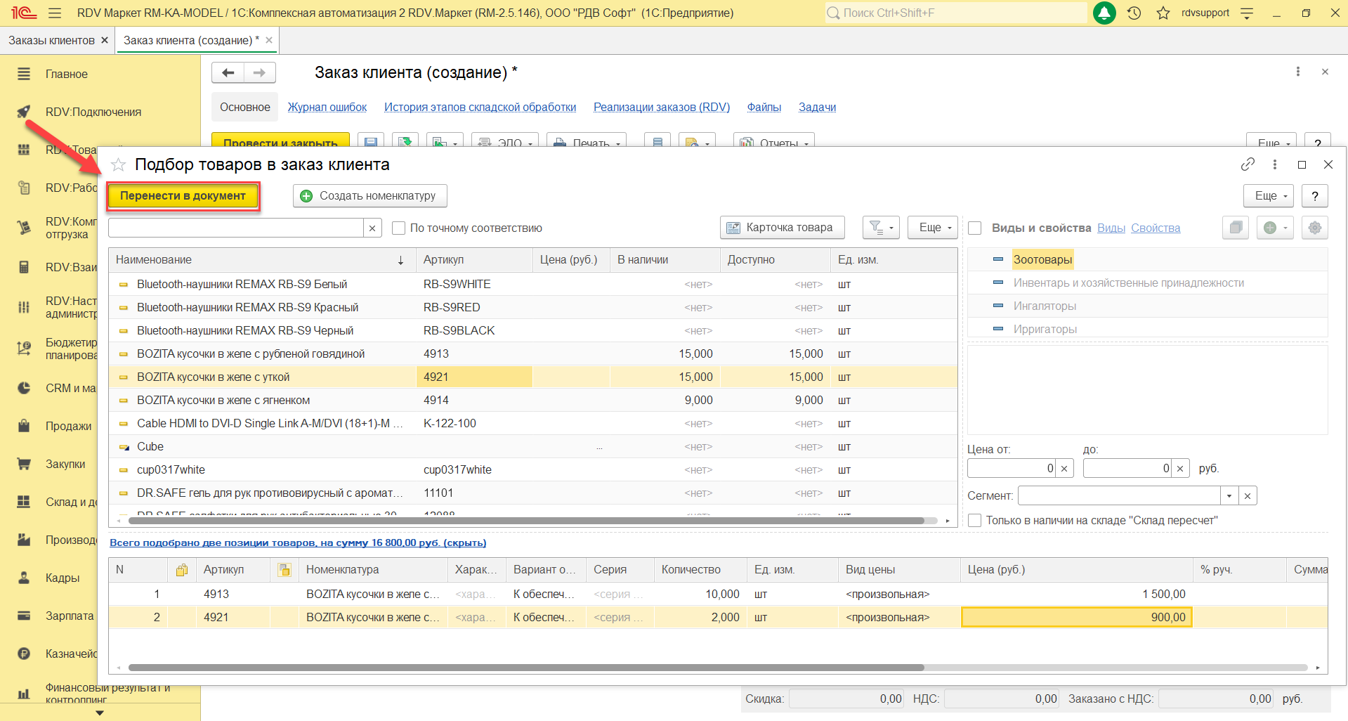 После подбора товаров для переноса в документ необходимо нажать кнопку "Перенести в документ":