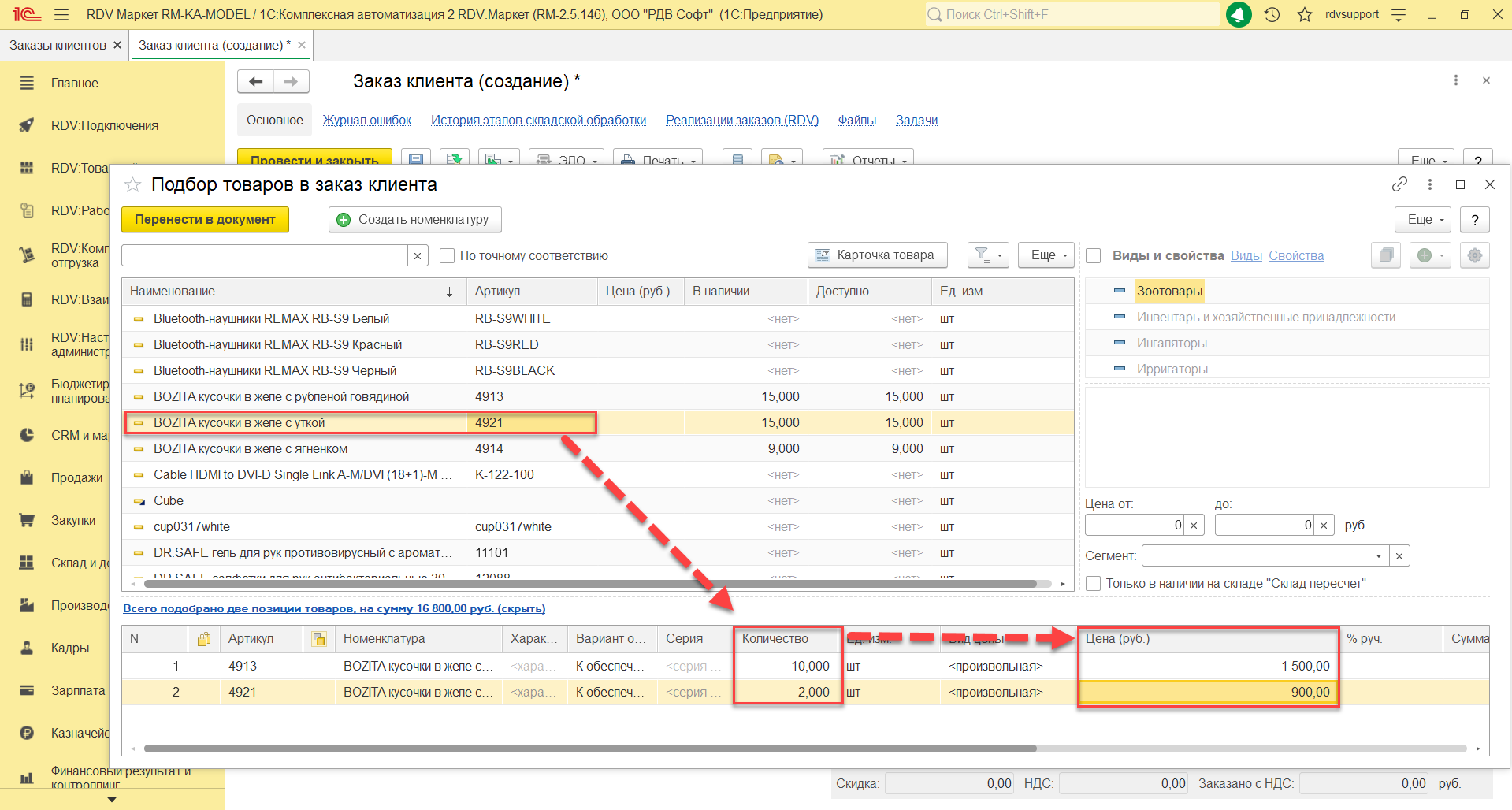 В открывшейся форме "Подбор товаров в заказ клиента" необходимо двойным кликом левой кнопки мыши выбрать необходимую номенклатуру, в разделе "Подобранные товар" указать количество и цены: