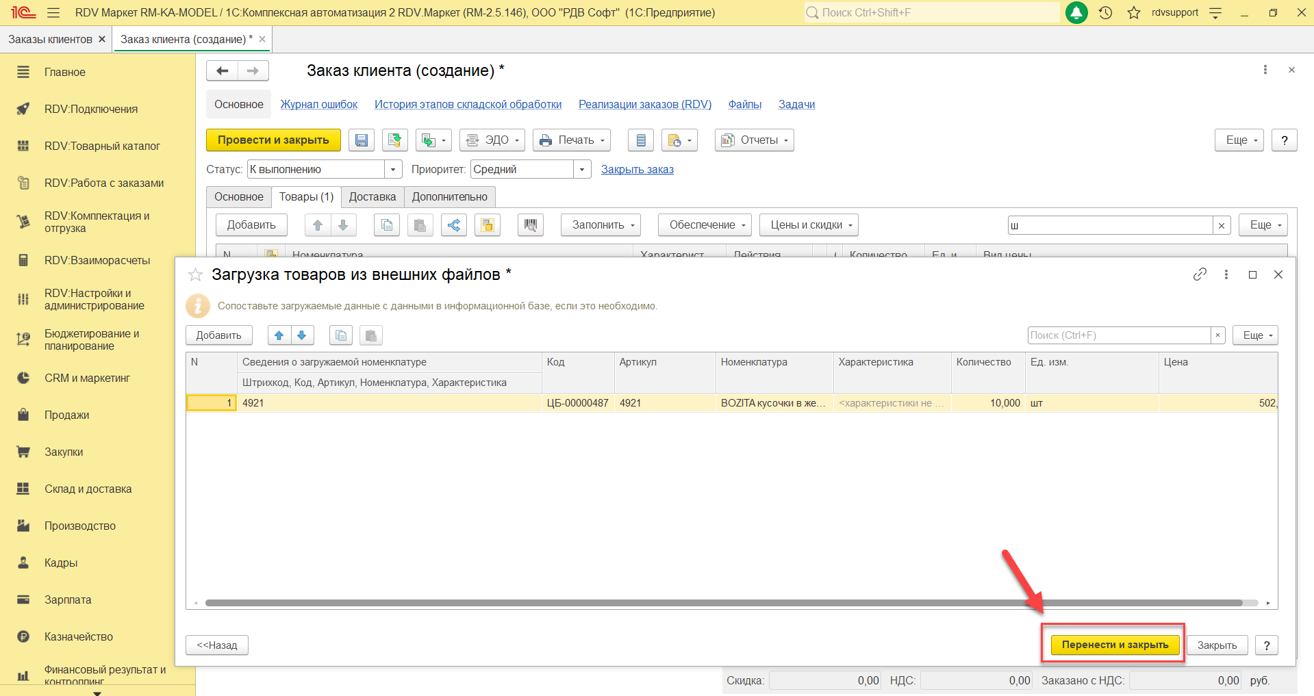 После заполнения таблицы "Загрузка товаров из внешних файлов" необходимо нажать кнопку "Далее", система отобразит сопоставленные товары. По команде "Перенести и закрыть" сопоставленные товары перенесутся в табличную часть "Товары" созданного документа "Заказ клиента":