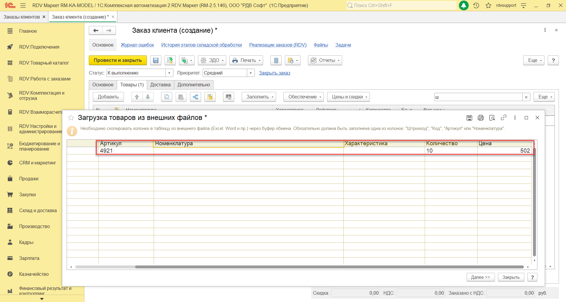 При использовании механизма "Загрузка из внешнего файла", открывается таблица, в которую необходимо вставить данные по товарам (предварительно данные можно скопировать, например, из файла Excel). Для поиска и сопоставления номенклатуры достаточно заполнить одно из полей "Штрихкод", Артикул" или "Номенклатура":