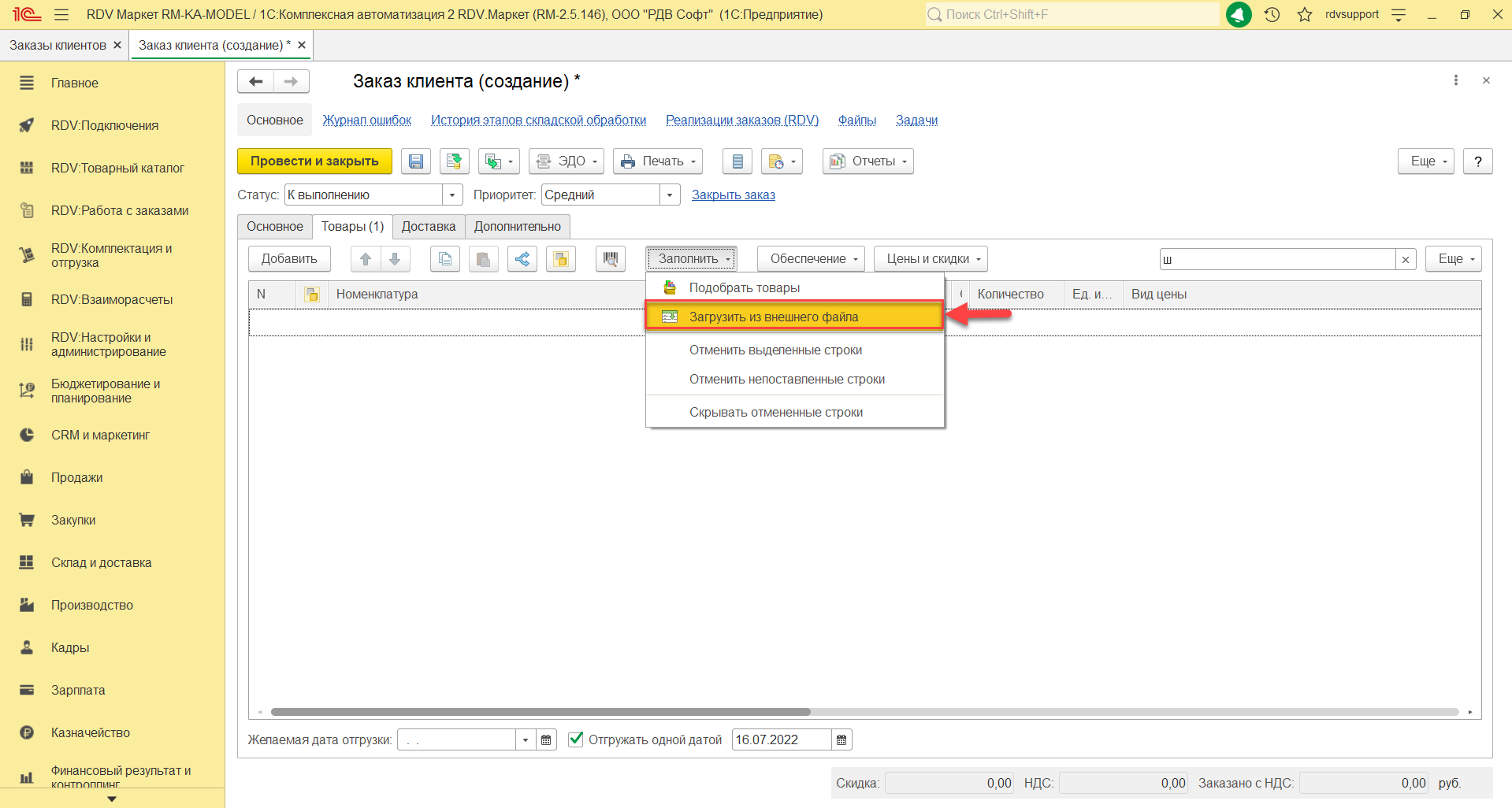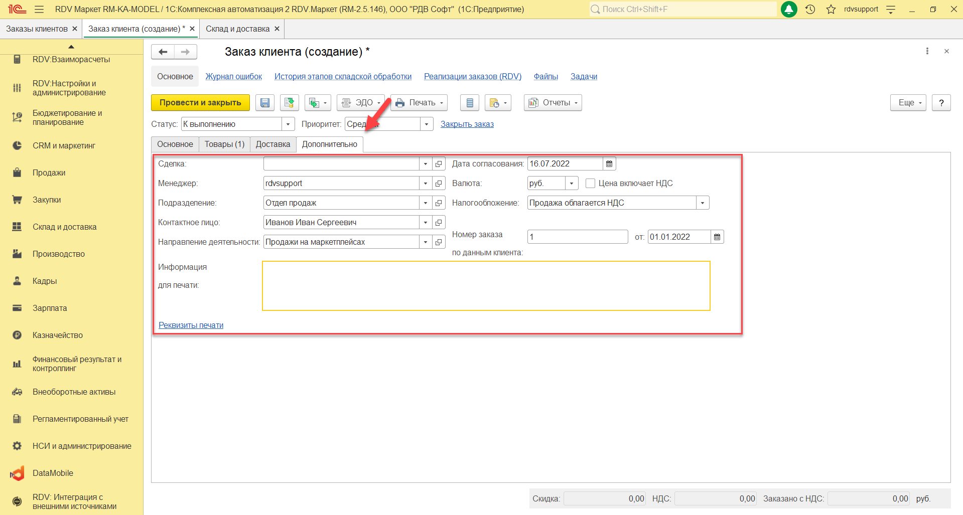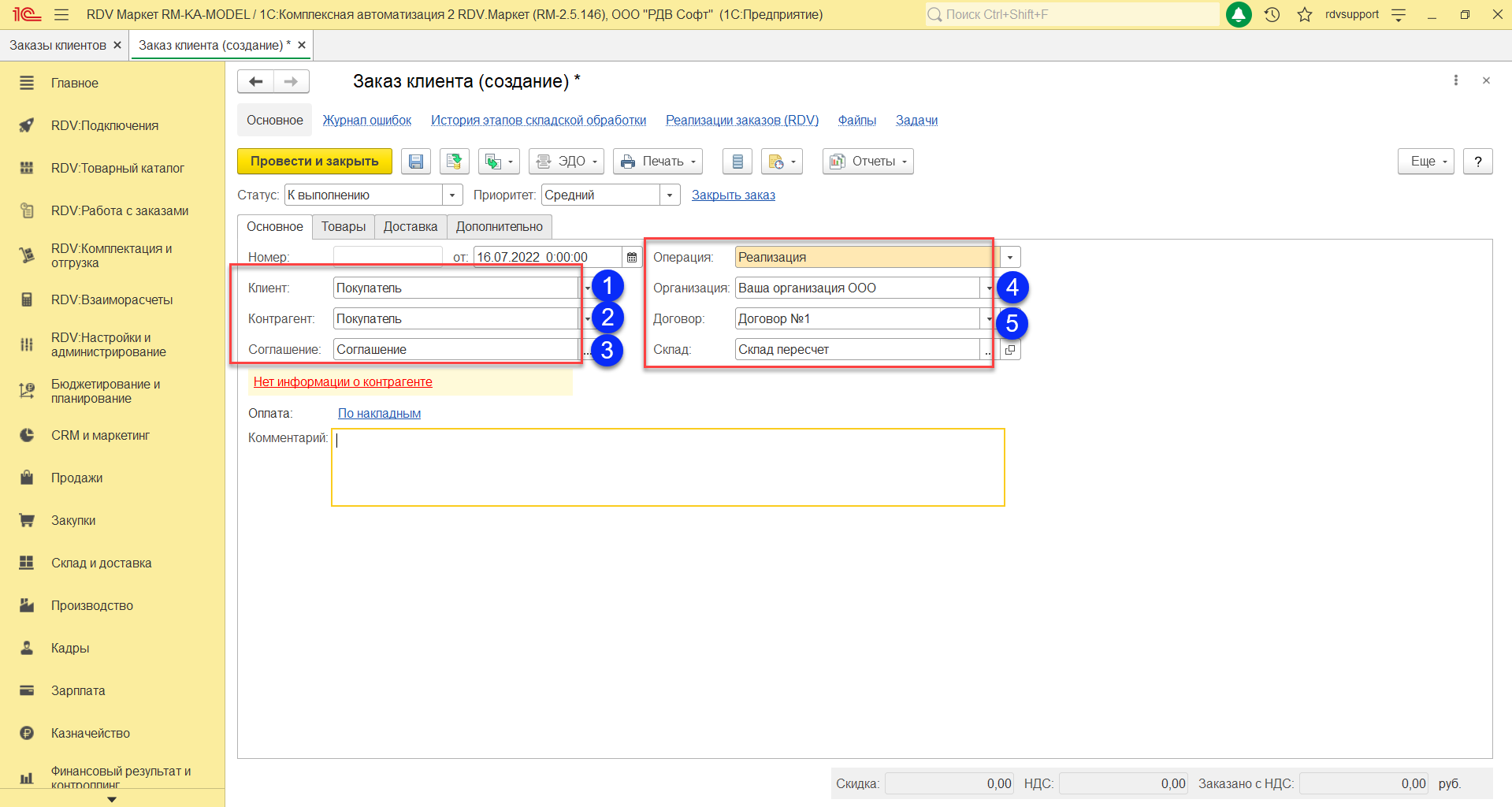 В открывшейся форме создания документа "Заказ клиента" на закладке "Основное" необходимо заполнять поля: