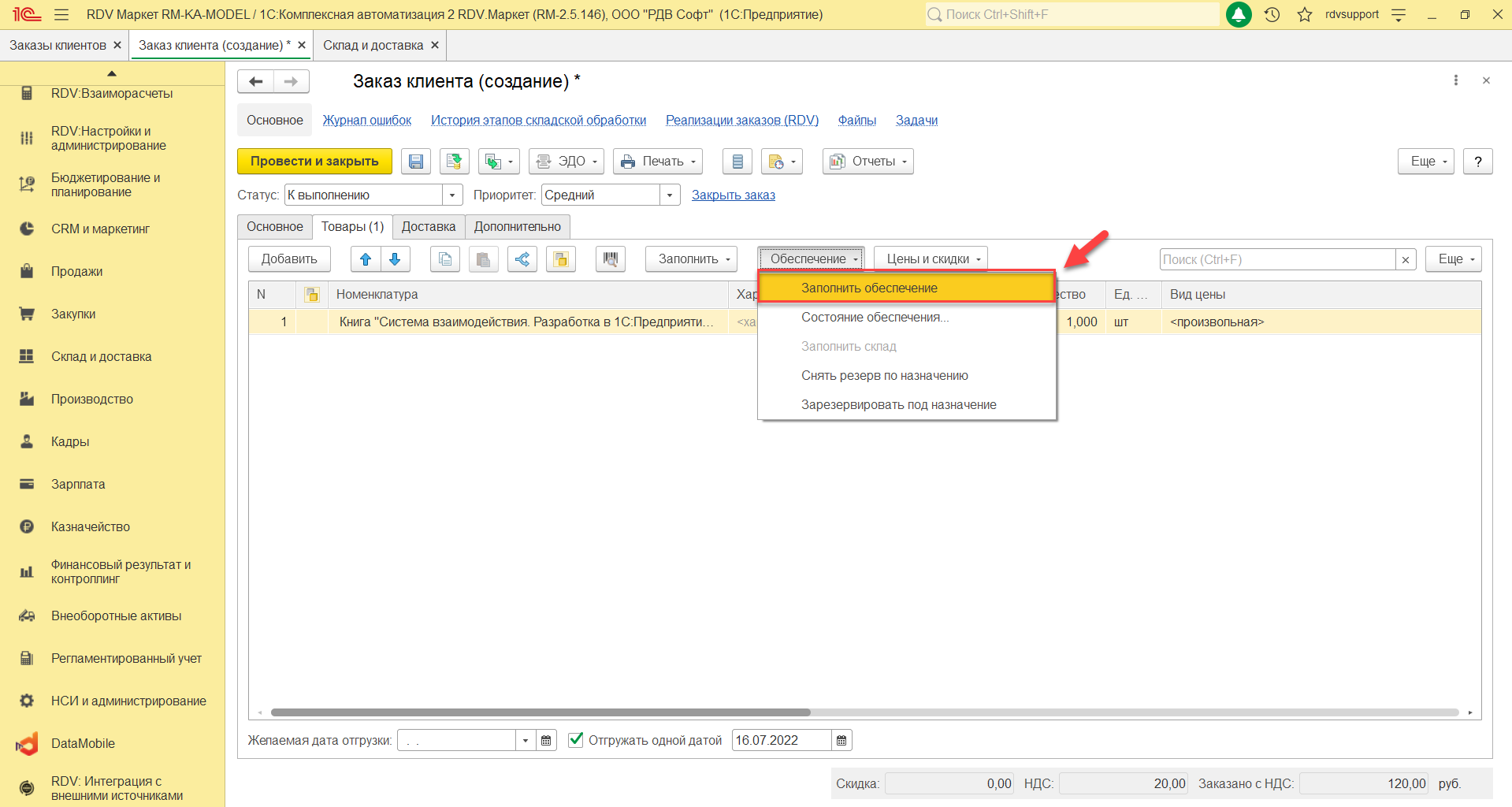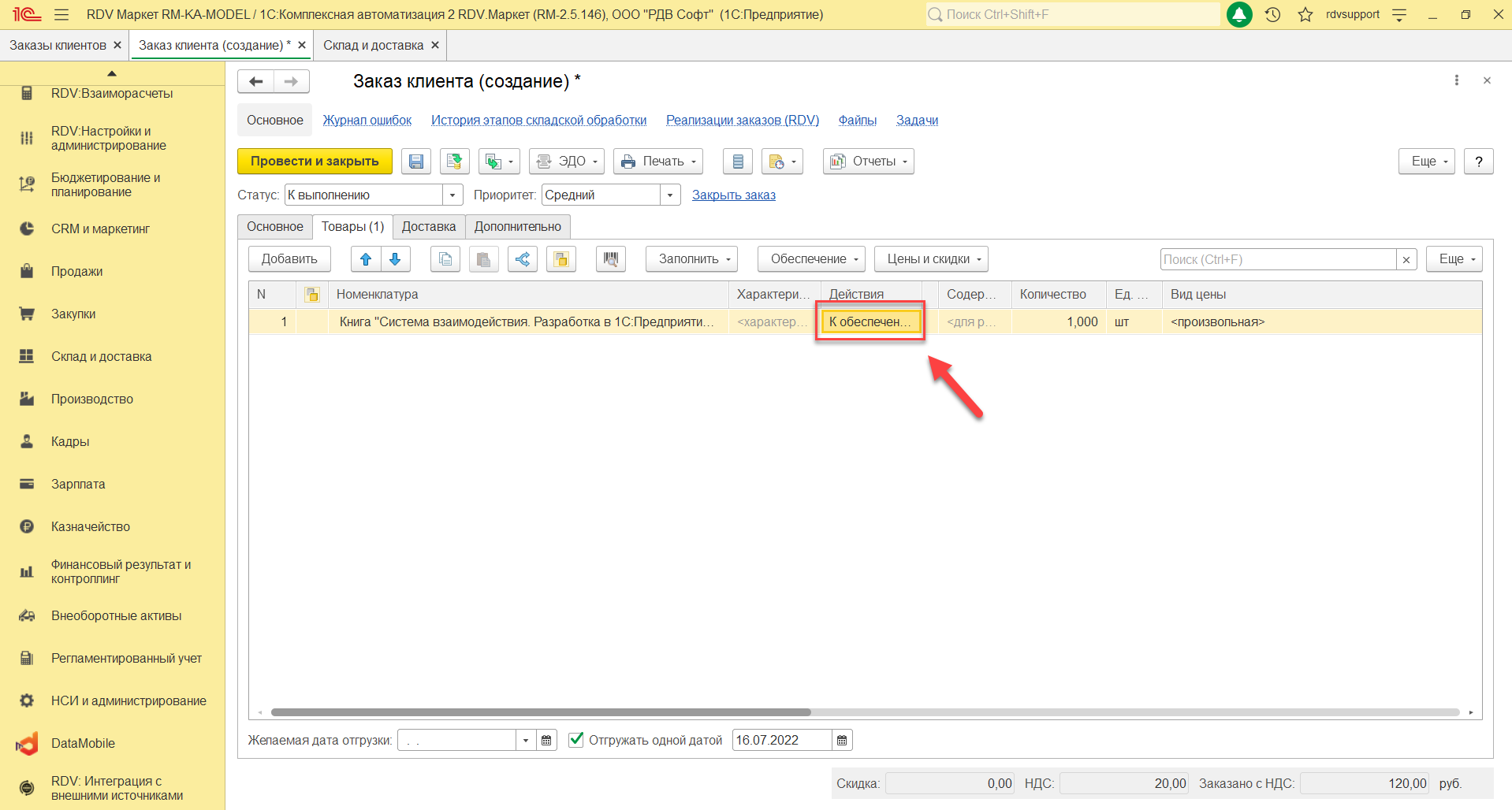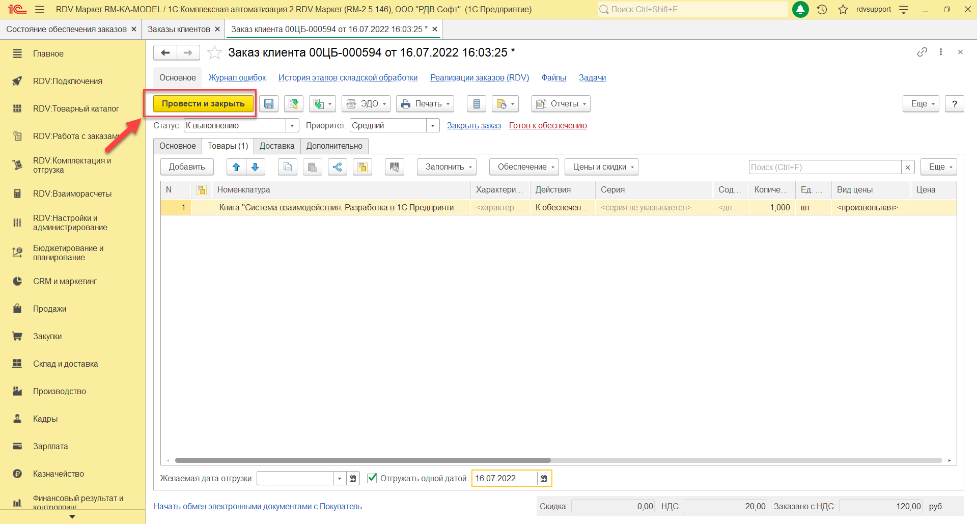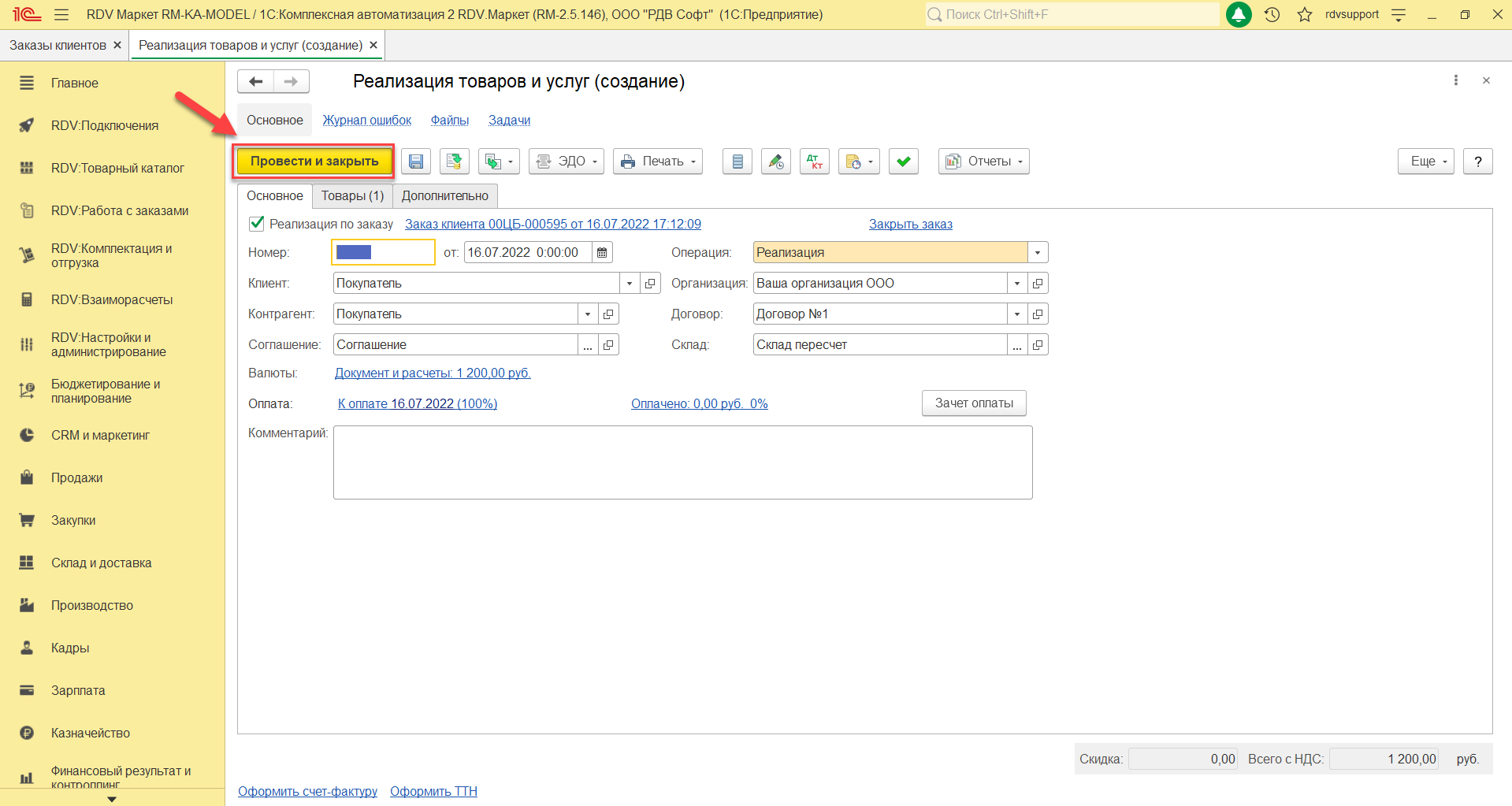 После заполнения документа "Заказ клиента" необходимо нажать кнопку "Провести и закрыть"