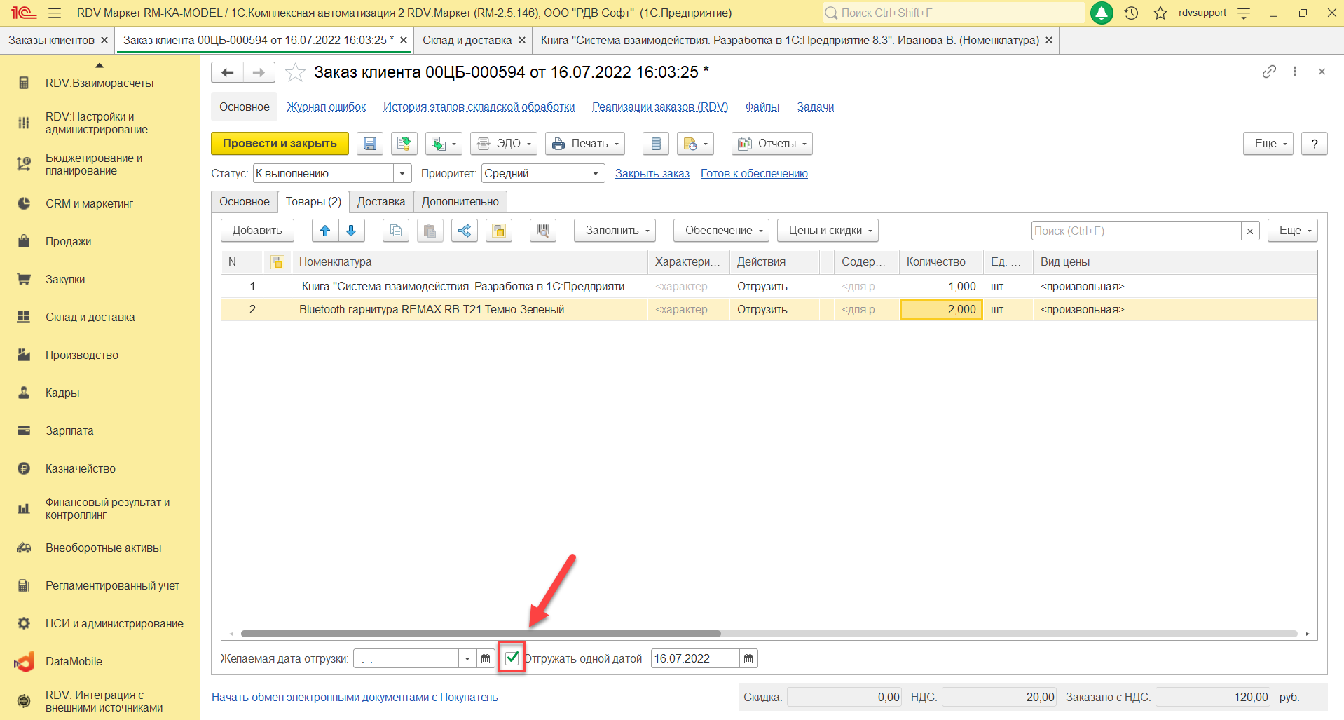 В документе "Заказ клиента" необходимо установить дату отгрузки. Дата, указанная в поле "Желаемая дата отгрузки", используется при расчете реальной даты отгрузки по товарам: