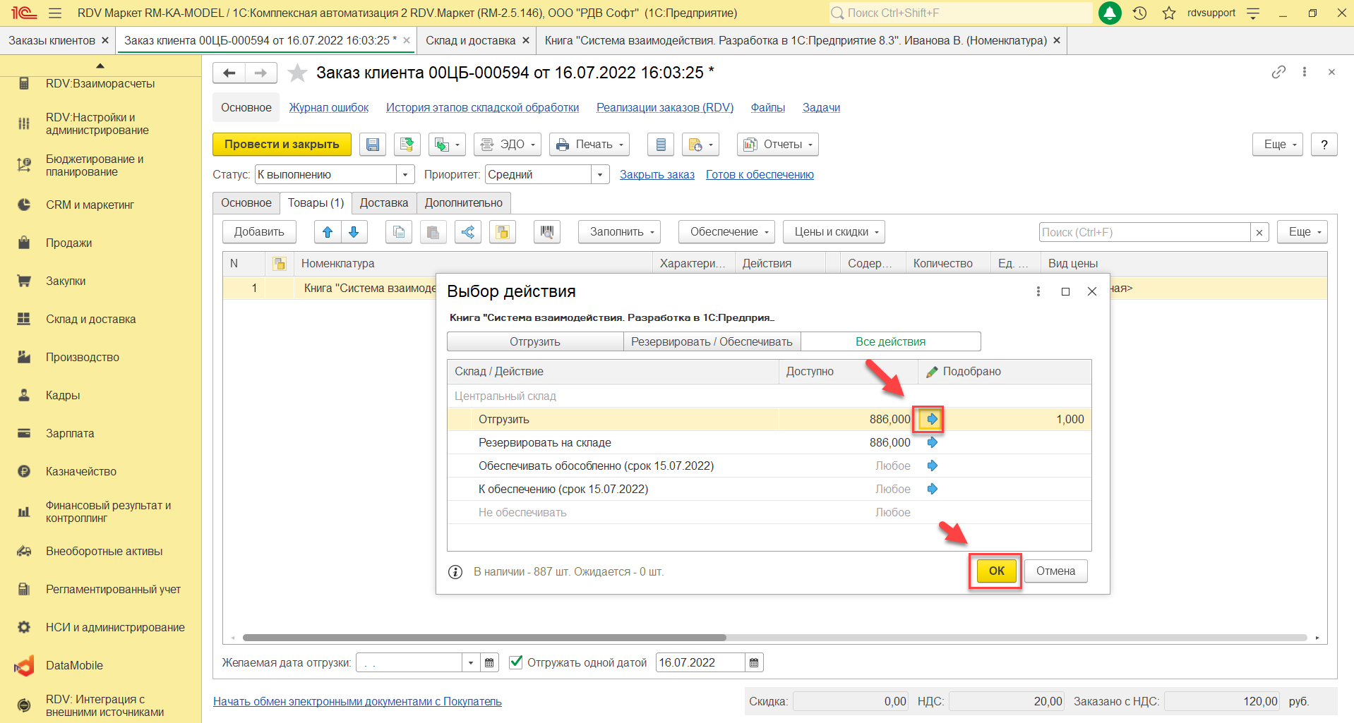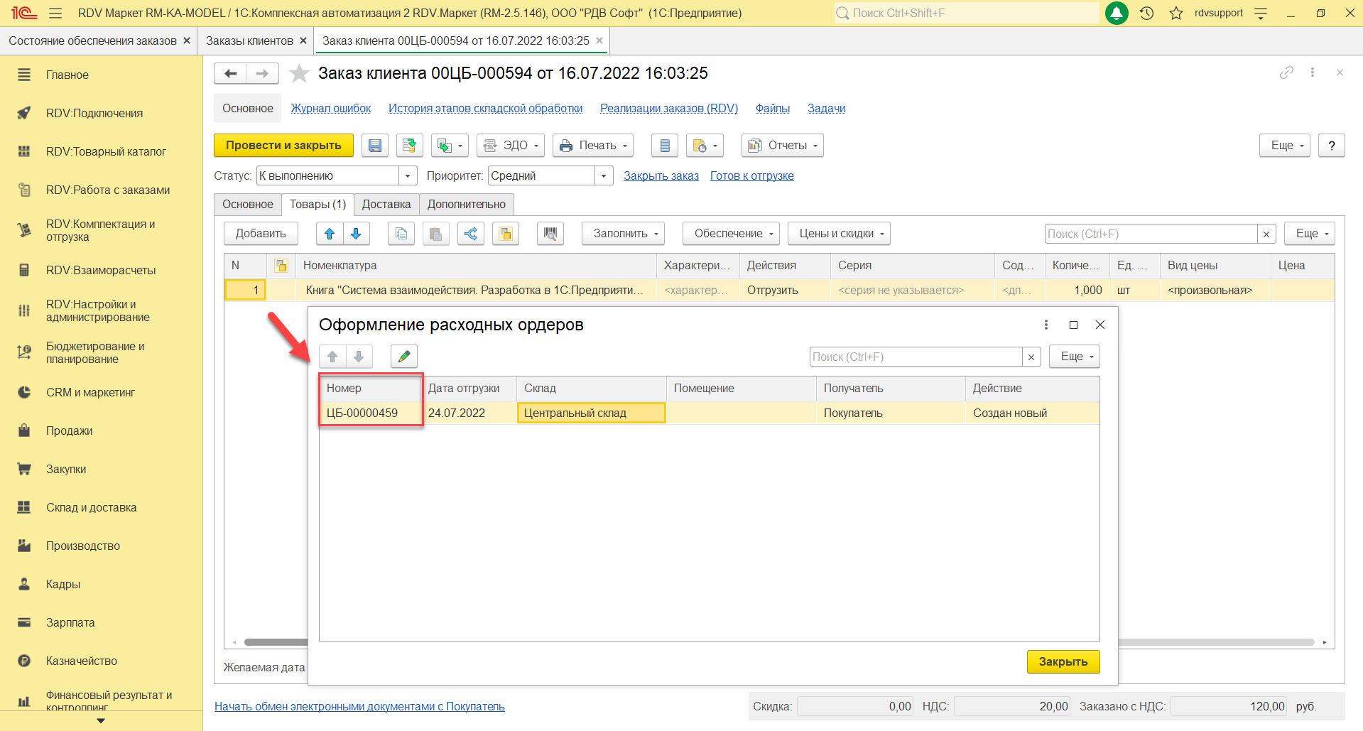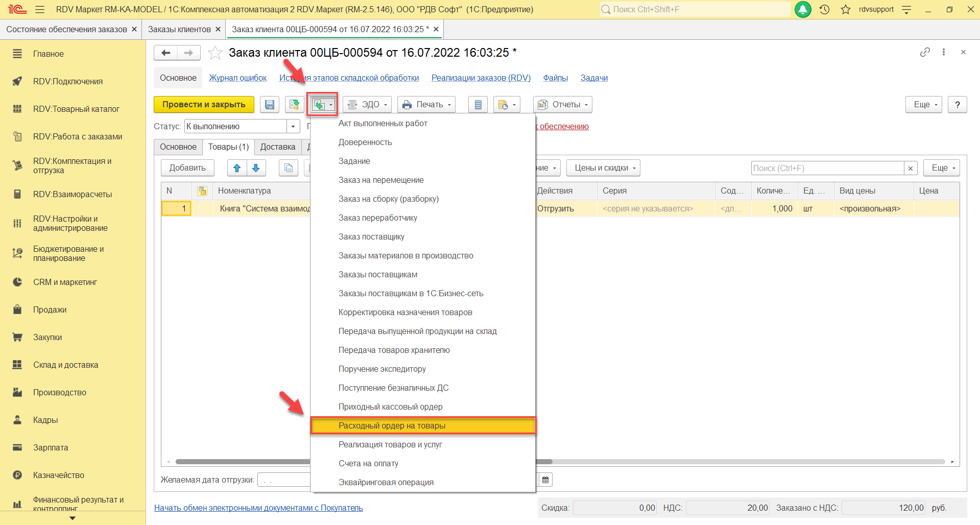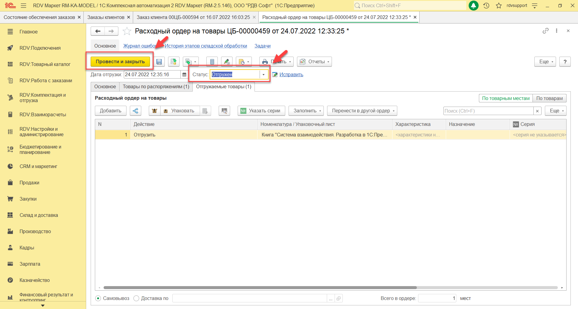 В созданном документе "Расходный ордер на товары" необходимо установить статус "Отгружен", нажать кнопку "Провести и закрыть":