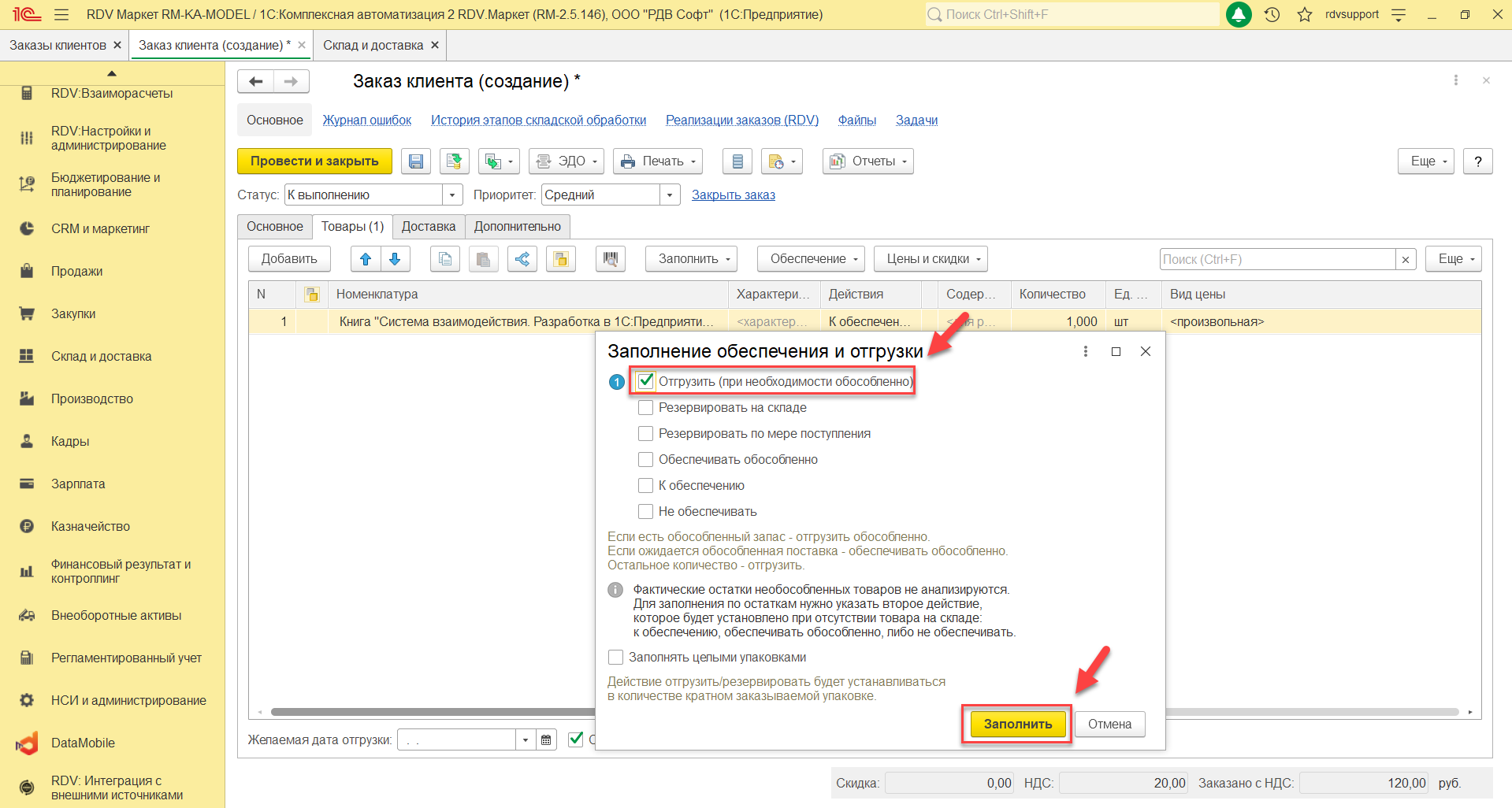 В открывшемся окне "Заполнение и обеспечение отгрузки" необходимо установить флажок "Отгрузить", нажать кнопку "Заполнить"