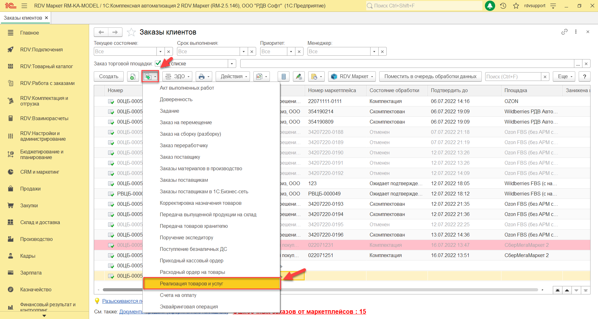 Для отражения продажи в системе предусмотрен документ "Реализация товаров и услуг". Для создания документа "Реализация товаров и услуг" на основании заказа клиента необходимо перейти в раздел "Продажи" - "Заказы клиентов":