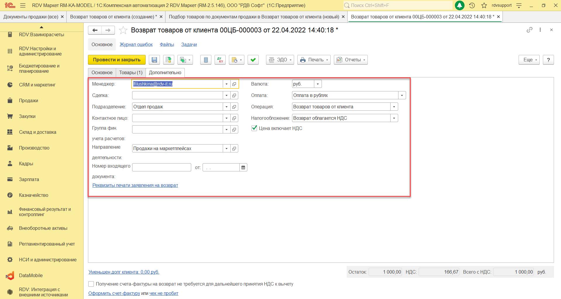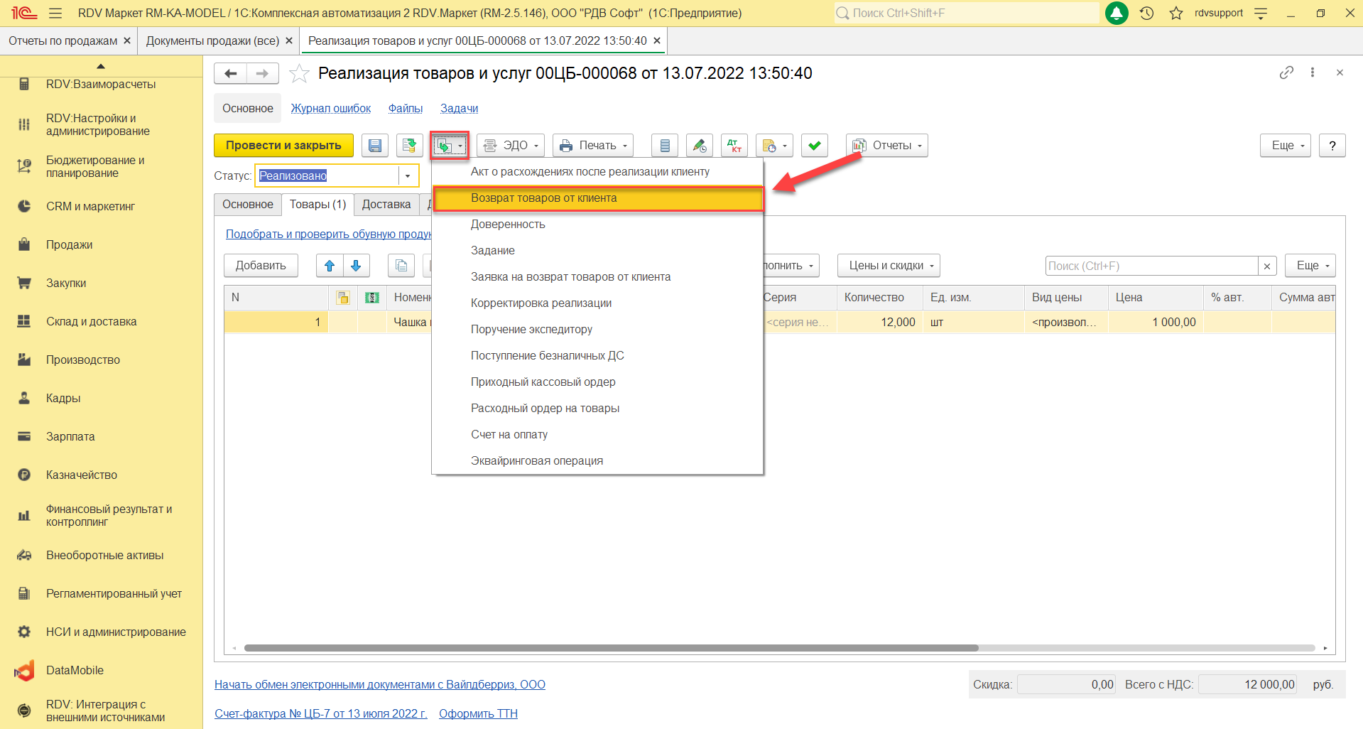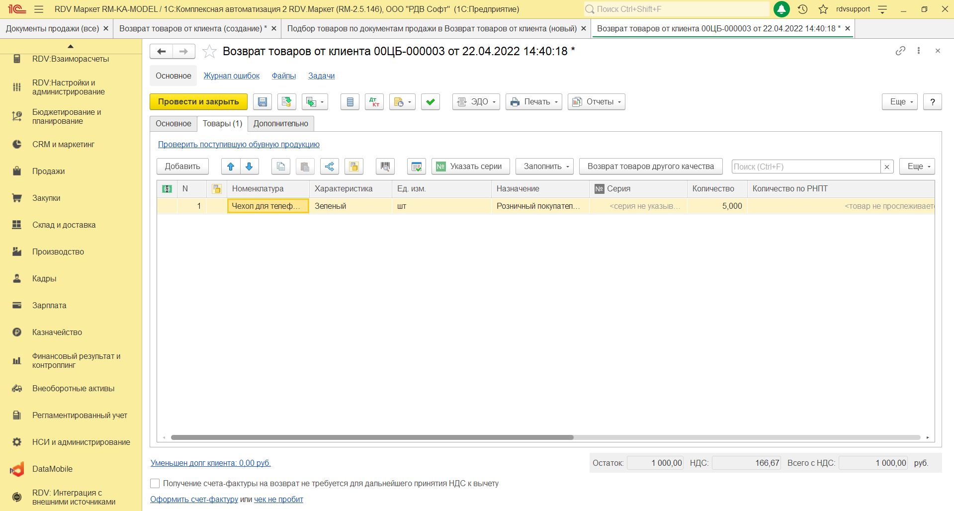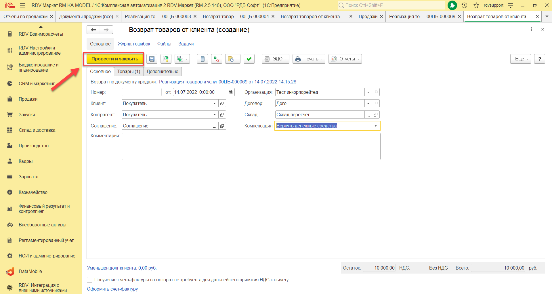 Необходимо проверить список возвращаемых товаров, после чего провести документ посредством нажатия кнопки "Провести и закрыть":