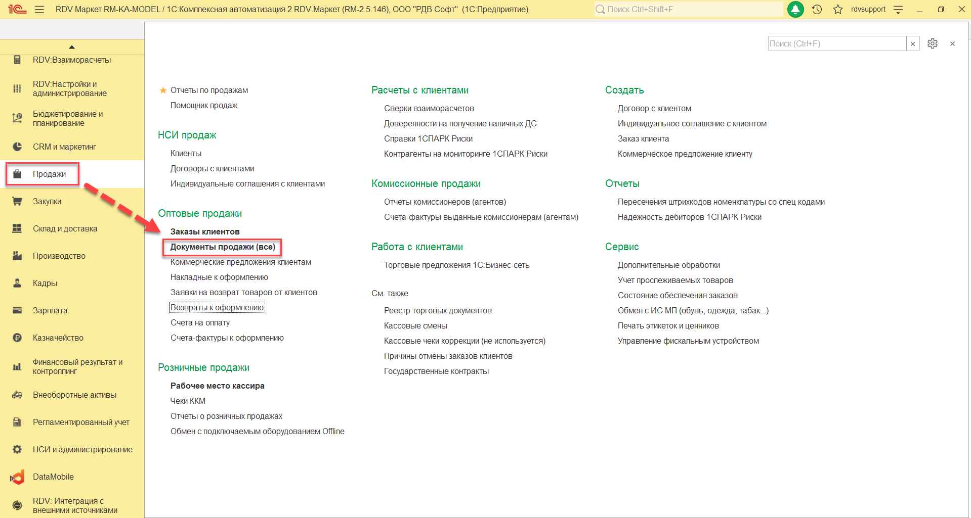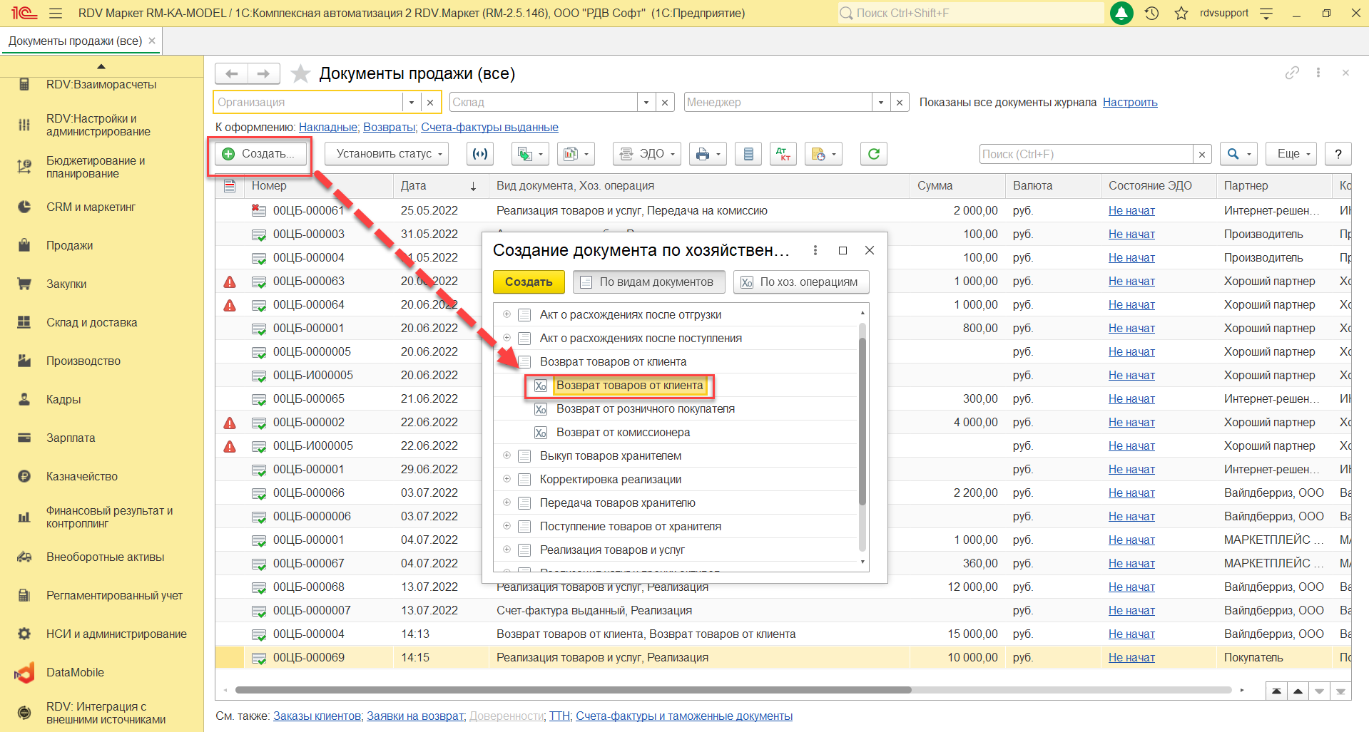В случае, если документ "Возврат товаров от клиента" создается не на основании документа продажи, то для создания документа "Возврат товаров от клиента" необходимо перейти в раздел "Продажи" - "Документы продажи все":