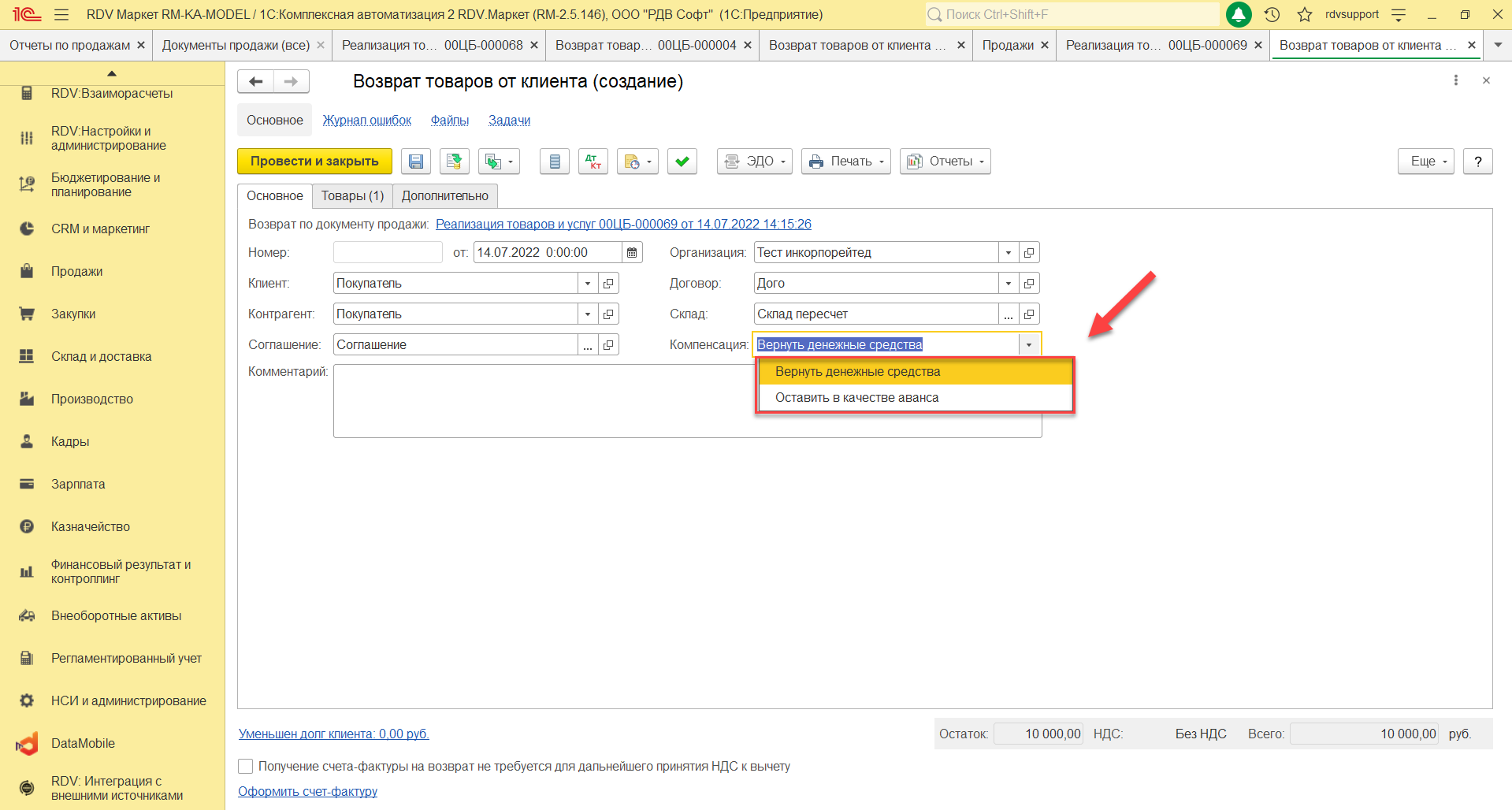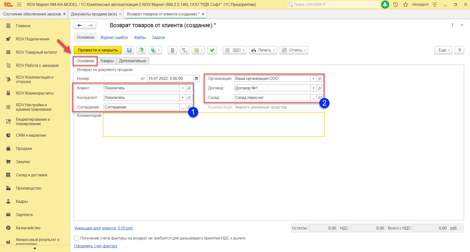 1.Клиента, Контрагента и Соглашение с клиентом, который возвращает товар