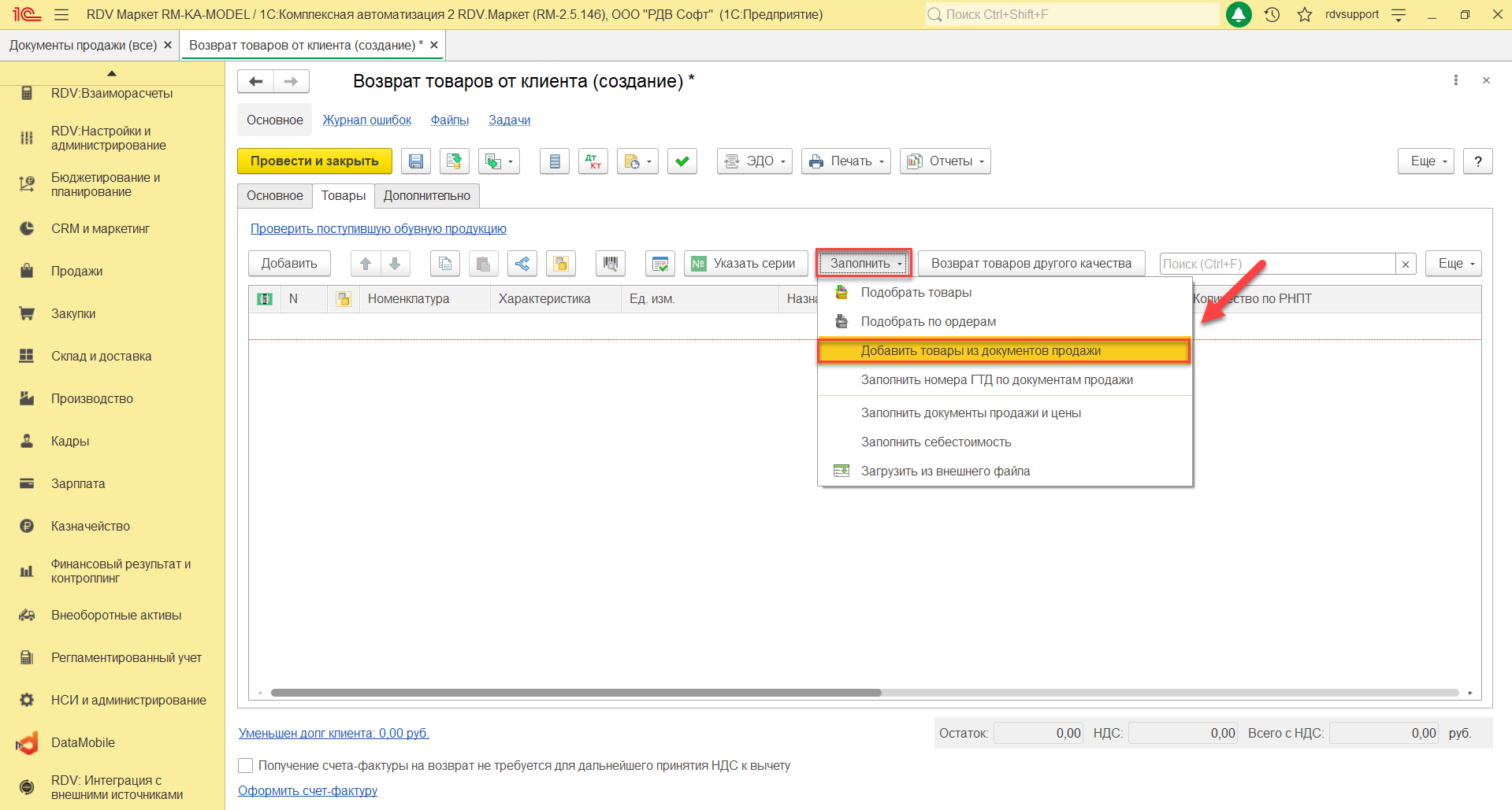 На закладке "Товары" для добавления товара необходимо нажать "Заполнить", выбрать способ заполнения "Добавить товары из документов продажи":