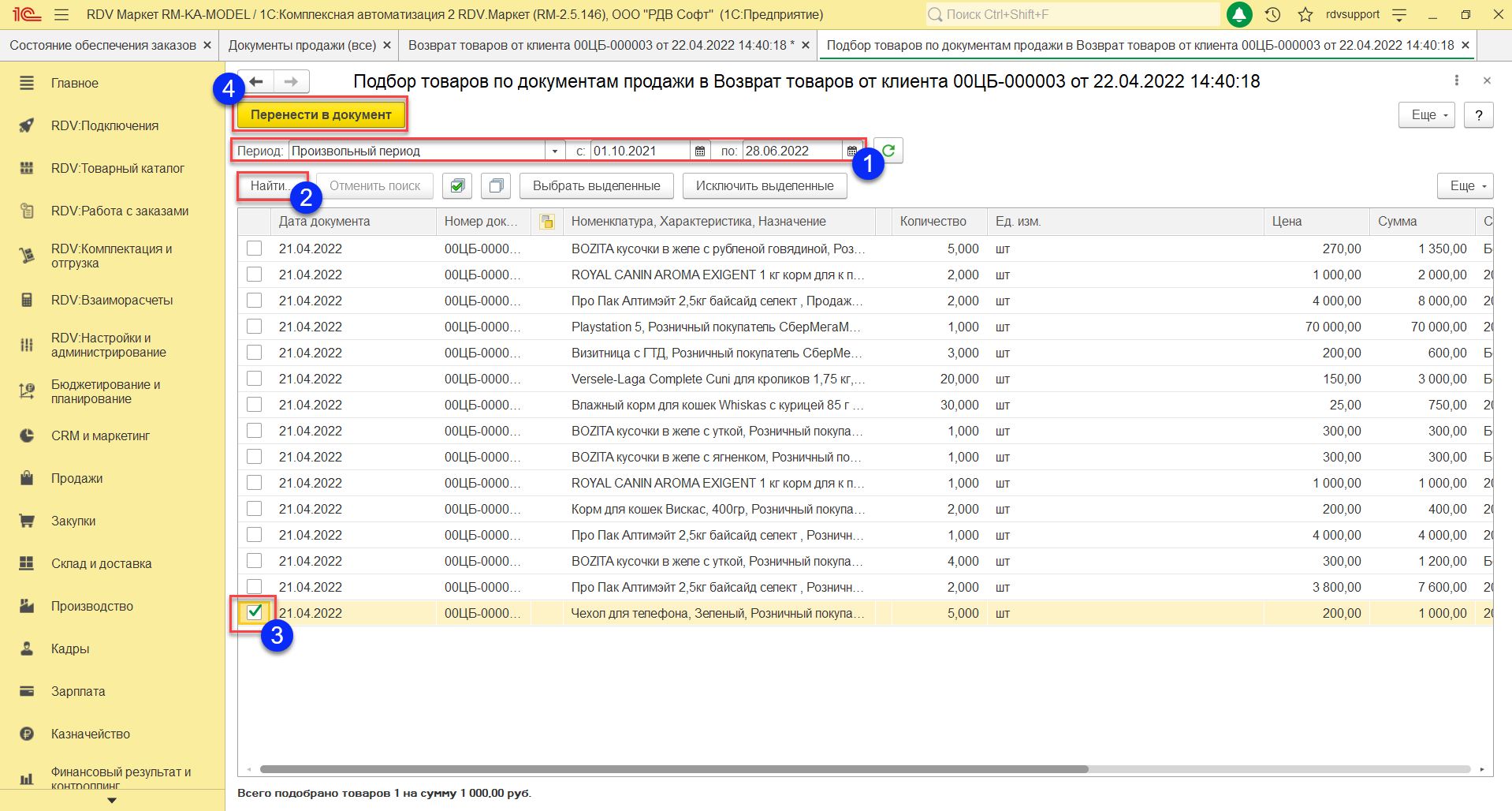 В документ "Возврат товаров от клиента" будет добавлен найденный товар:
