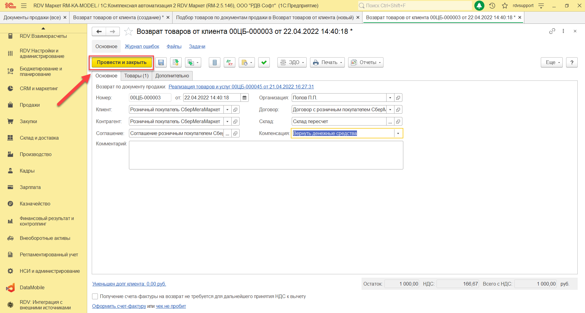 Для завершения отражения возврата товаров от клиента необходимо провести документ нажатием на кнопку "Провести и закрыть":