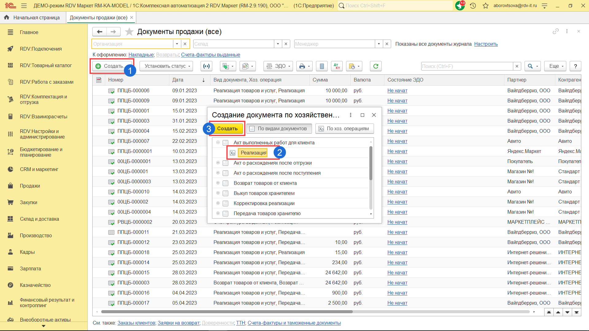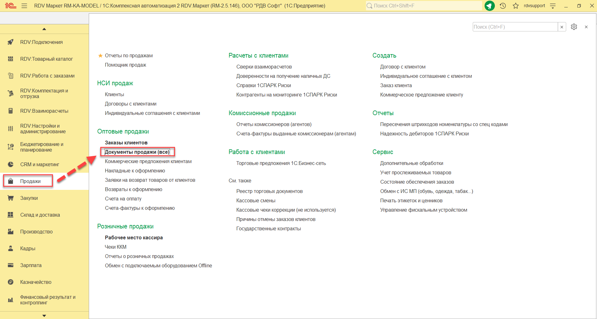 Для отражения выполненных работ (услуг) в системе предусмотрен документ "Акт выполненных работ". Для создания данного документа необходимо перейти в раздел "Продажи" - "Документы продажи (все)":