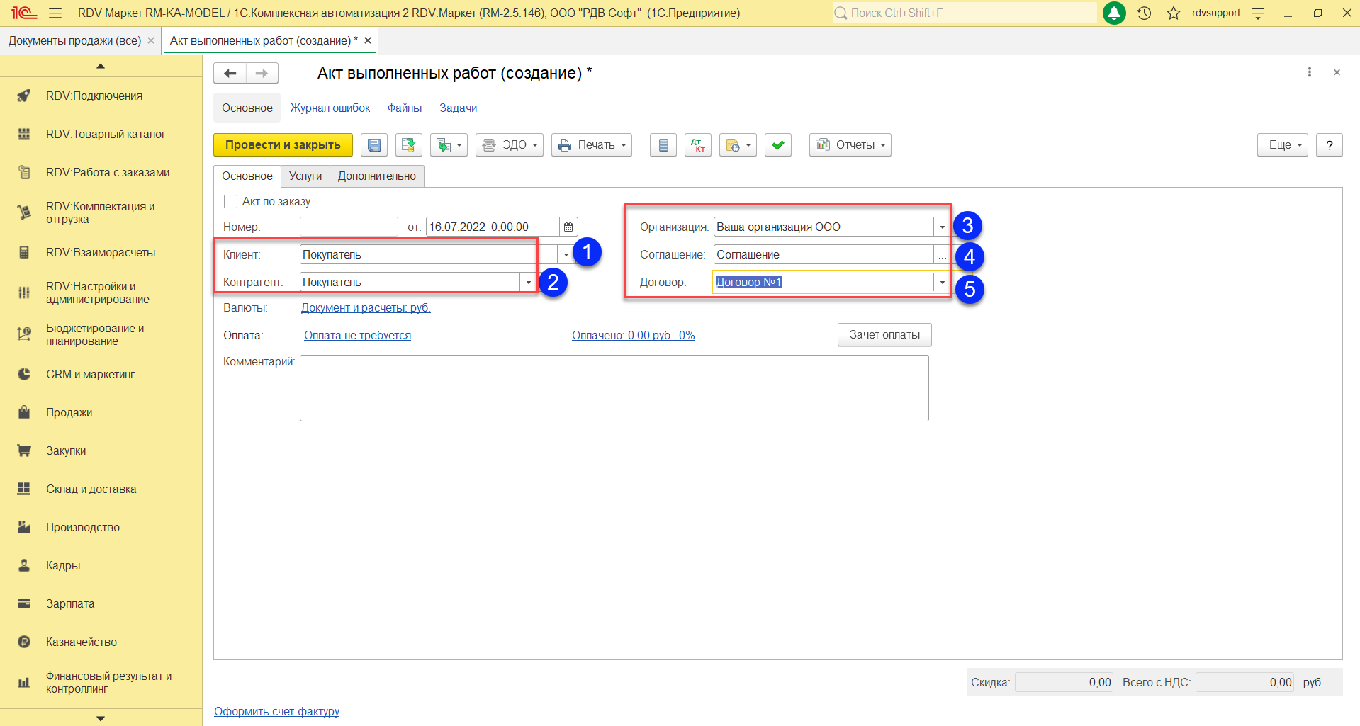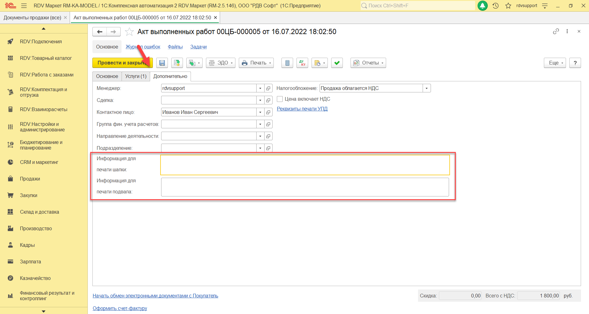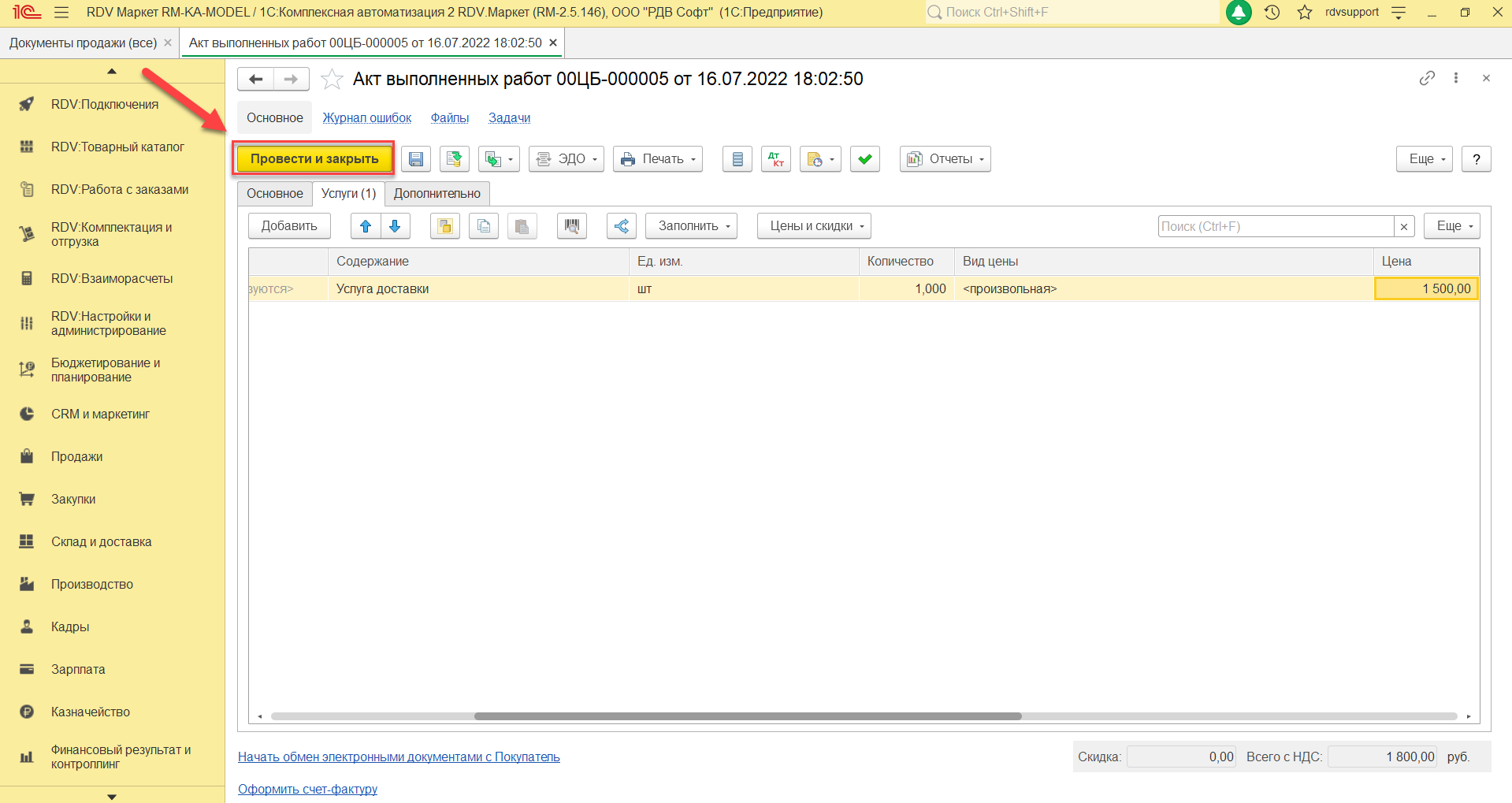 Для завершения создания документа нажмите на кнопку "Провести и закрыть":