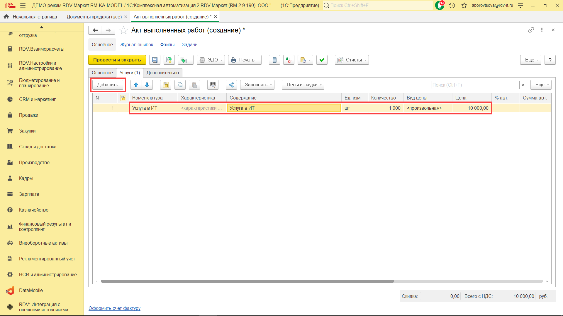На вкладке "Услуги" необходимо нажать кнопку "Добавить", выбрать необходимую номенклатуру, указать её количество и стоимость: