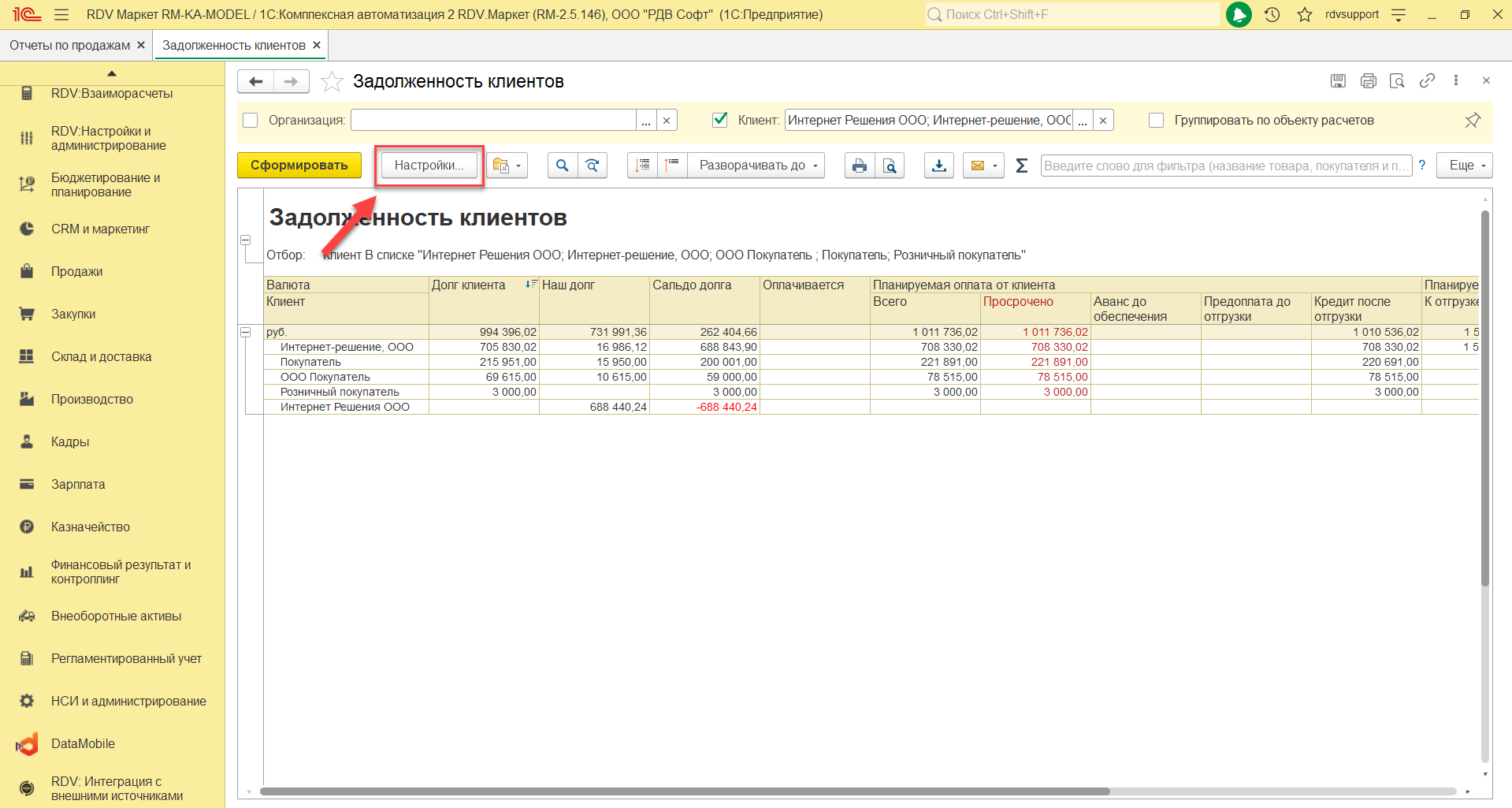 Для формирования отчета "Задолженность клиентов" с детализацией по объектам расчетов необходимо нажать кнопку "Настройки":