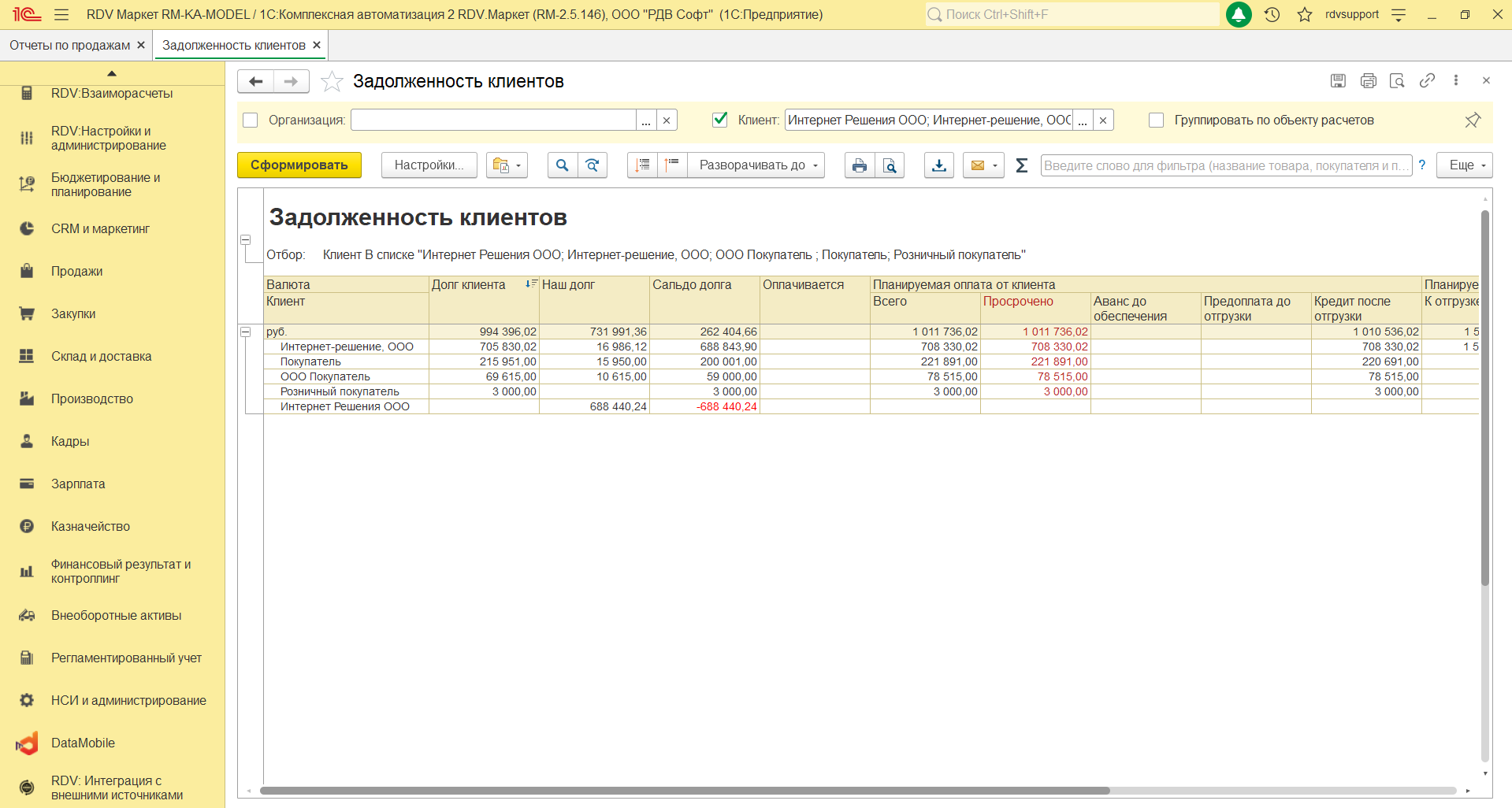 Данный отчет позволяет проанализировать задолженность клиентов и задолженность перед клиентами: