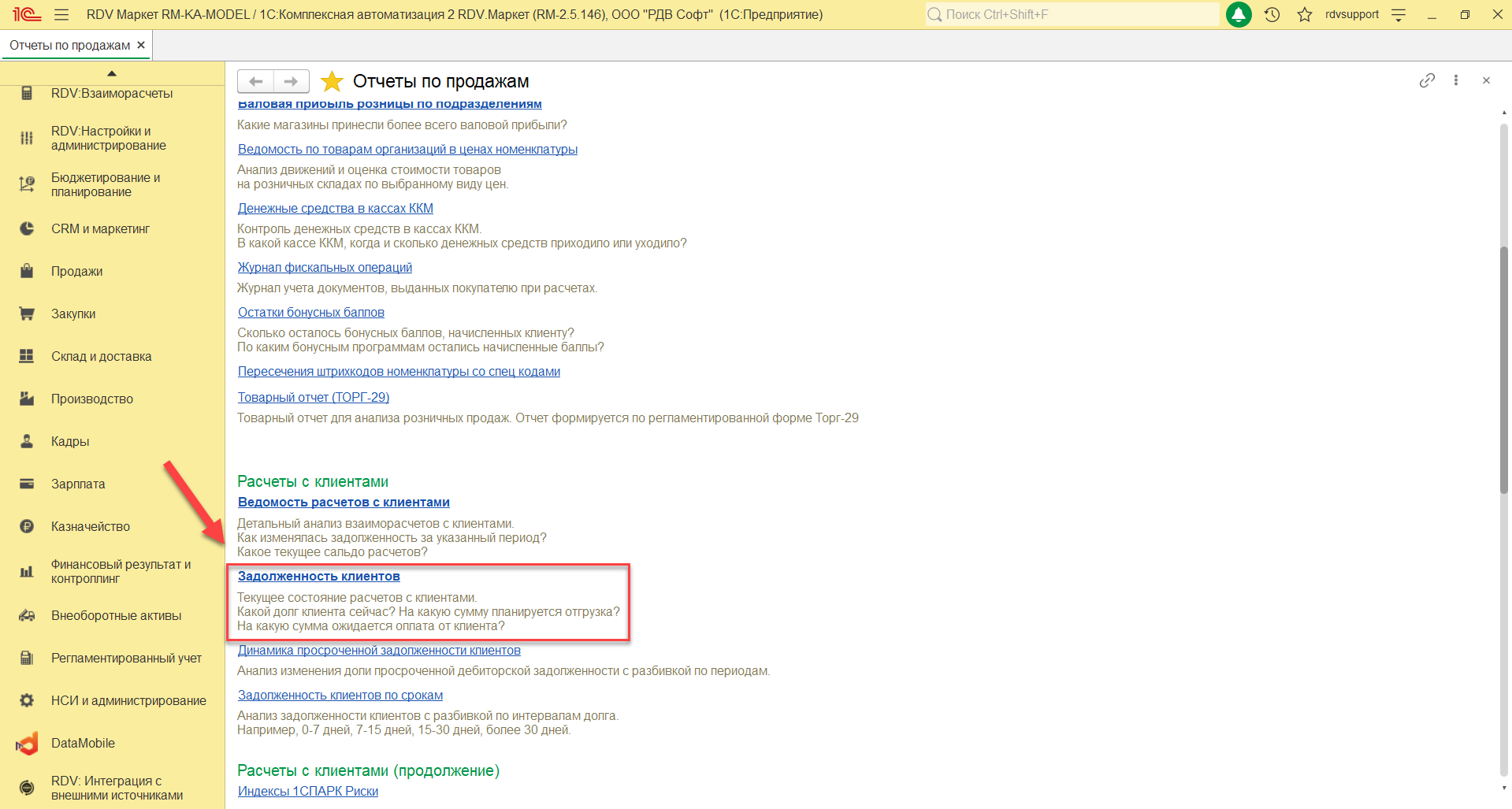 Для анализа задолженности клиентов предусмотрен отчет "Задолженность клиентов". Данный отчет расположен в разделе: "Продажи" – "Отчеты по продажам":