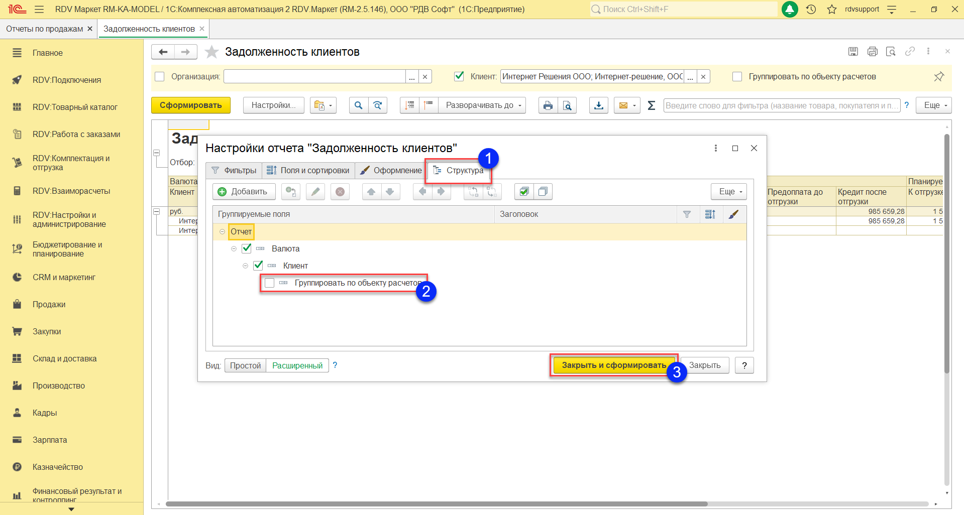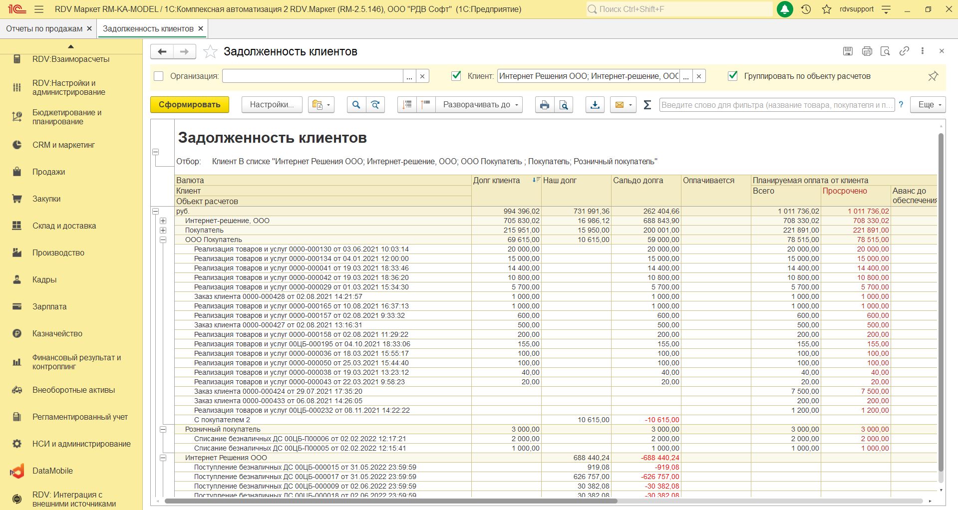 Формирование отчета "Задолженность клиентов" с детализацией по документам расчетов