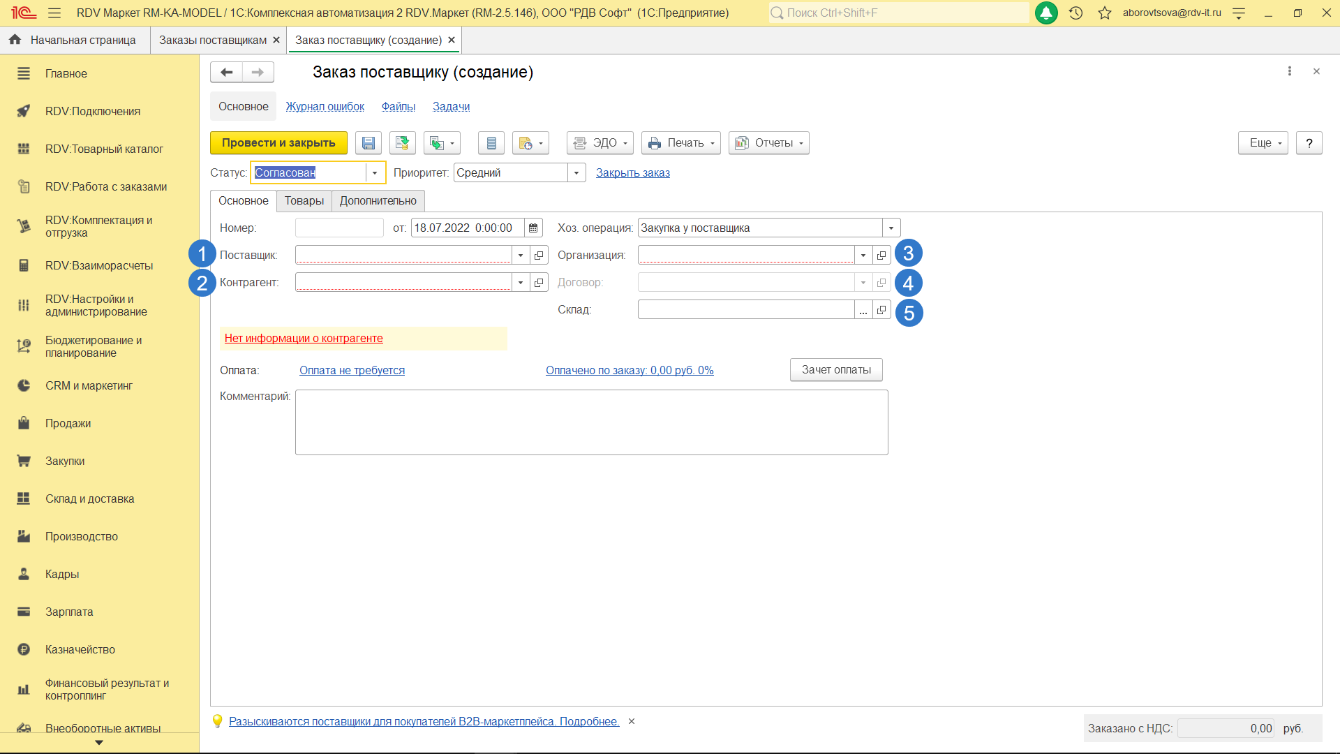На вкладке "Основное" важно заполнить: поставщика, контрагента (если у поставщика указан один контрагент, то графа заполнится автоматически), название вашей организации, договор между вашей организацией и поставщиком (если между вашей и организацией и поставщиком имеется один договор, то графа заполнится автоматически), склад приёма товаров.