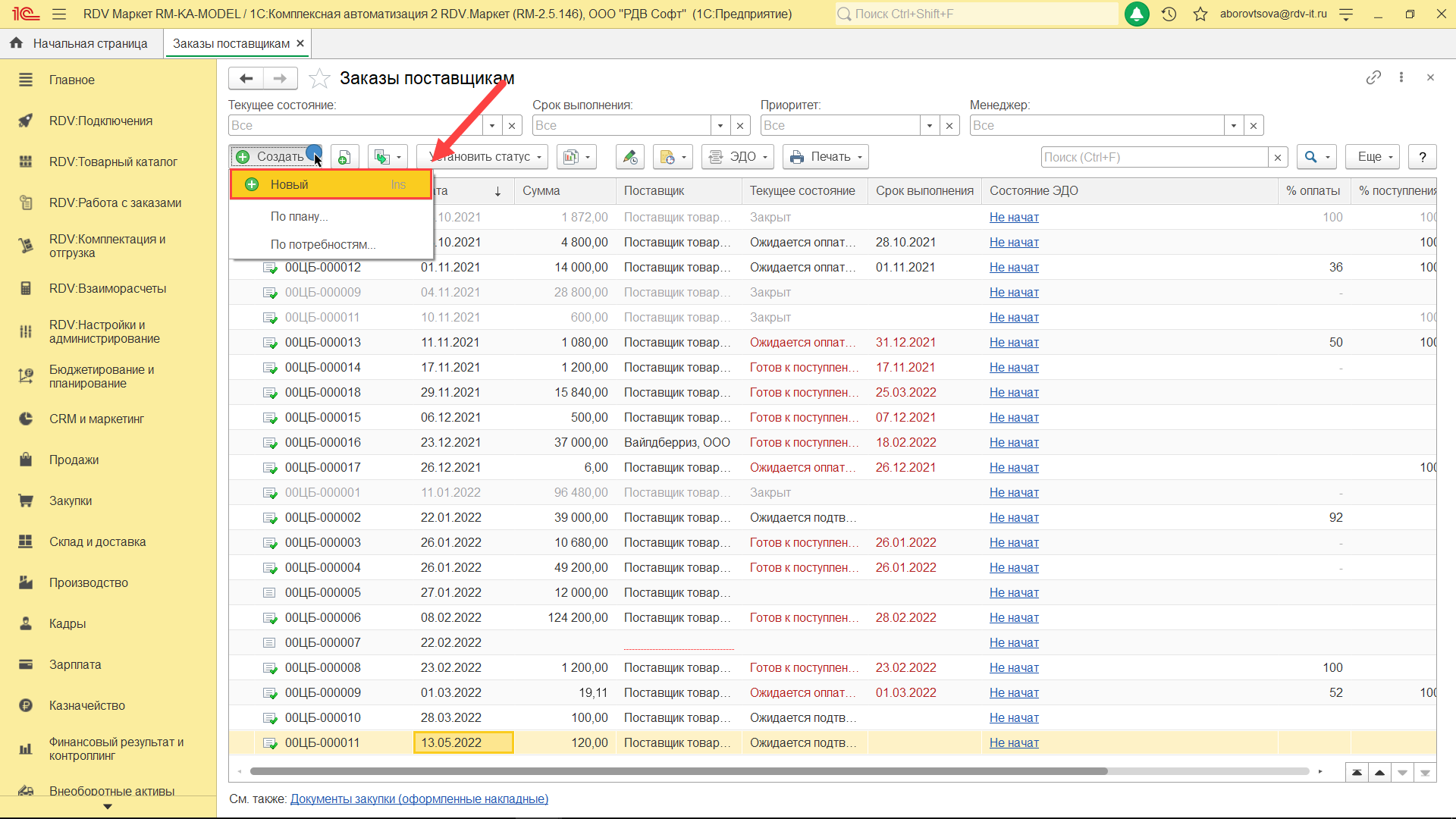 Для того чтобы создать заказ поставщику, зайдите в раздел «Закупки» - «Заказы поставщикам» и нажмите на кнопку «Создать» - «Новый».
