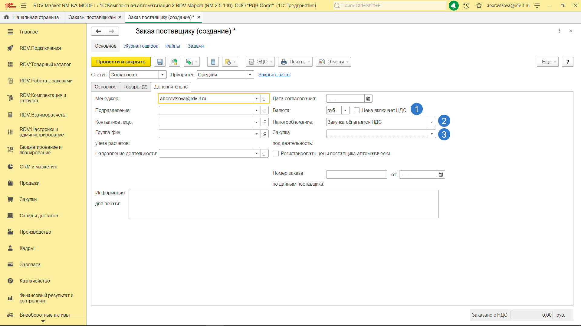 На вкладке "Дополнительно" важно указать: валюту, налогообложение и закупку под деятельность.