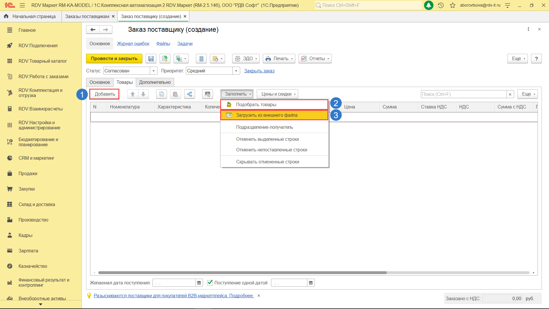 - Загрузить товары с помощью файла через кнопку "Заполнить" - "Загрузить из внешнего файла".