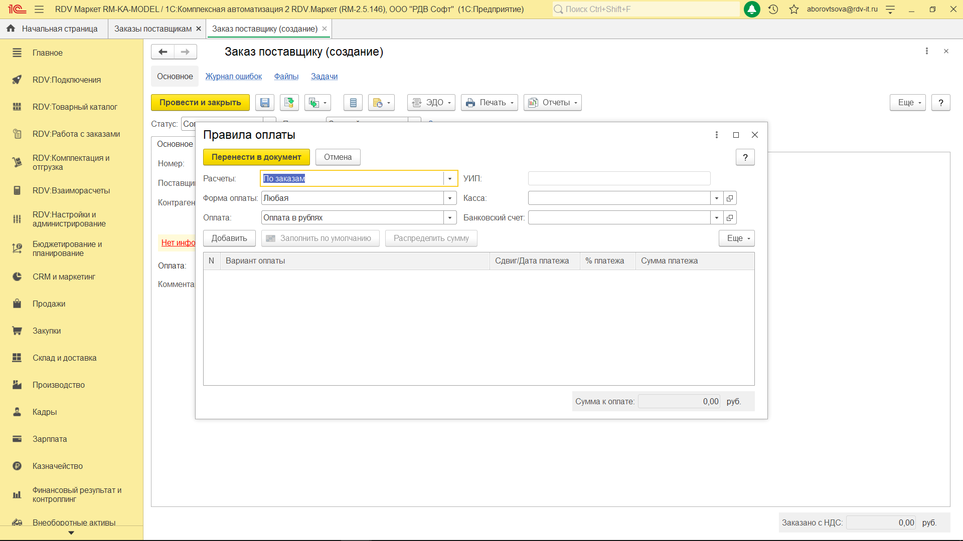 Также вы можете установить условия оплаты в самом заказе поставщика, нажав на гиперссылку "Оплата".