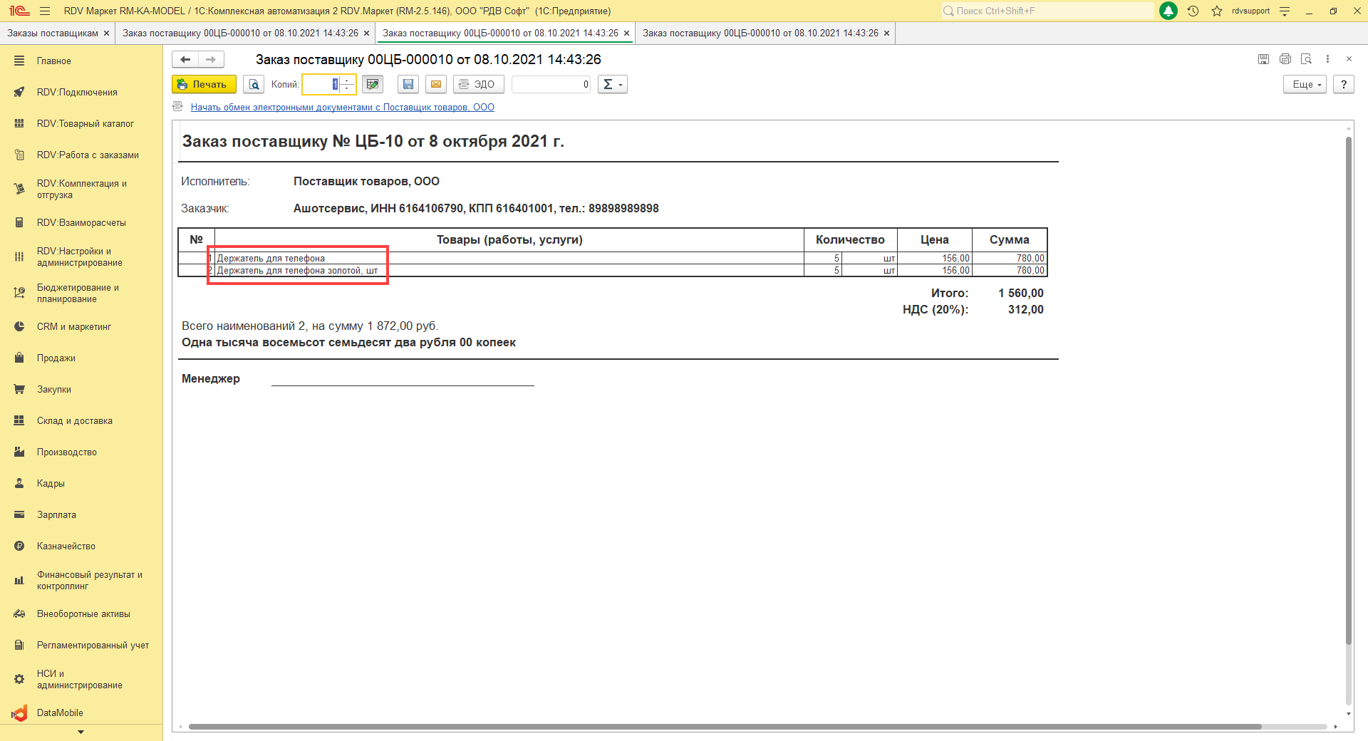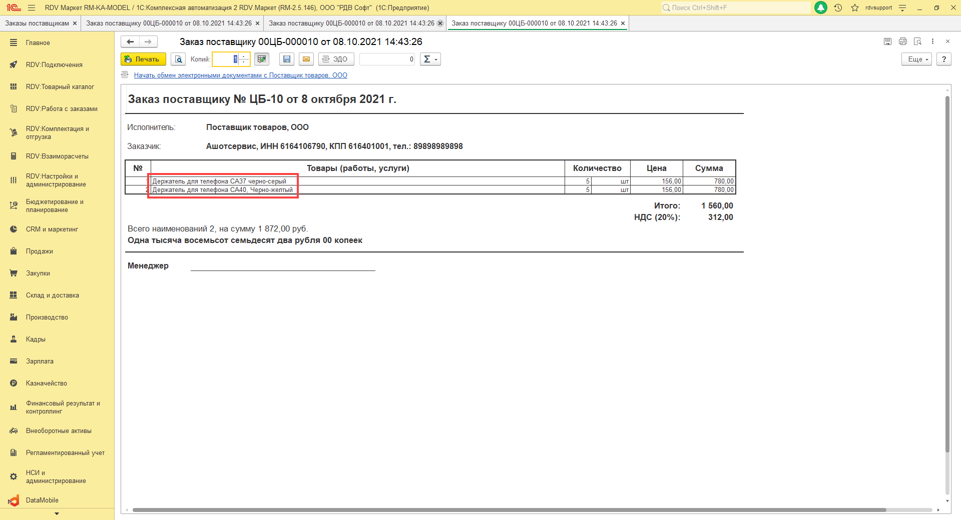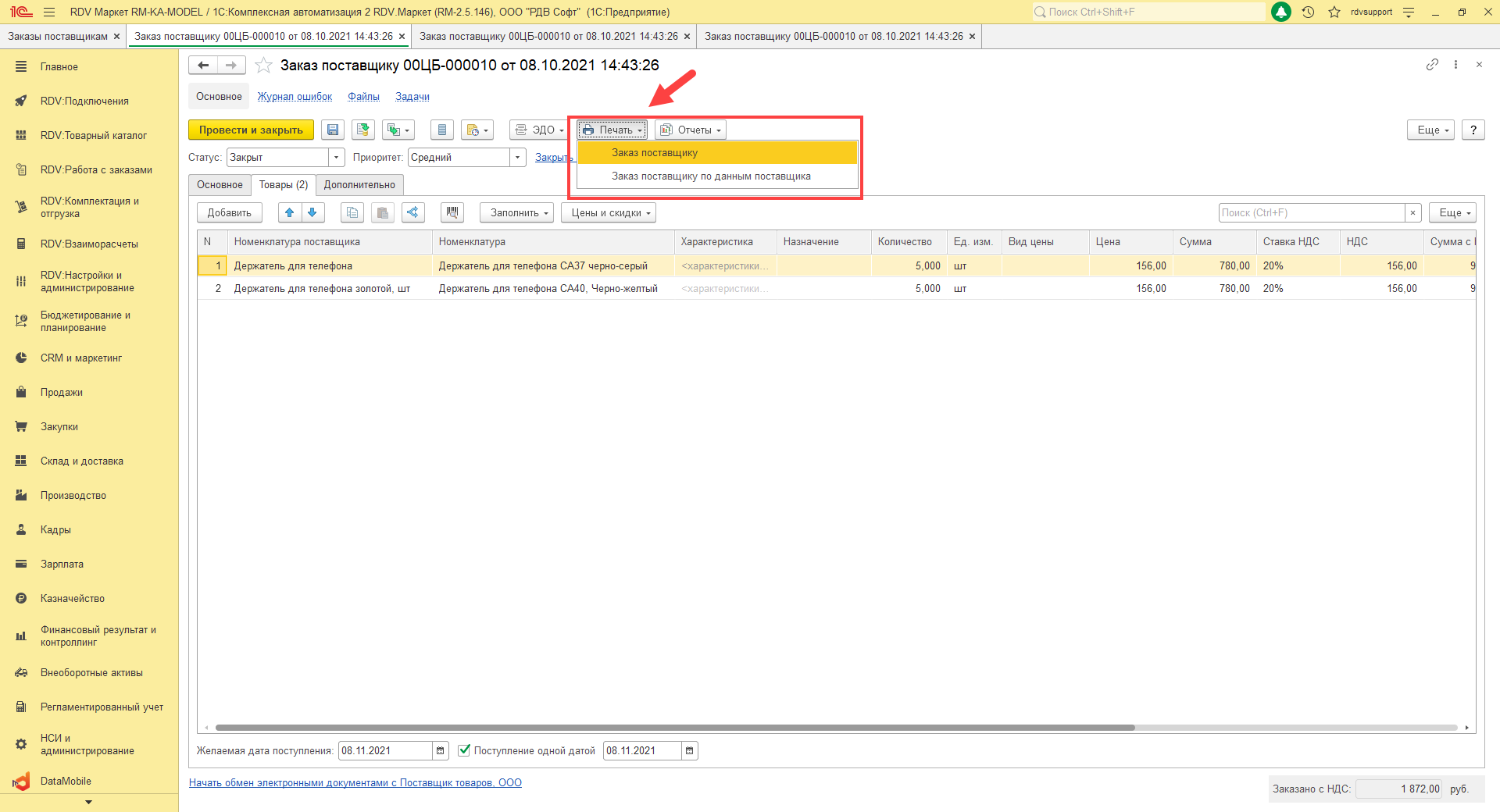 Для того, чтобы распечатать заказа поставщику, нажмите на кнопку "Печать" и выберите форму печати: