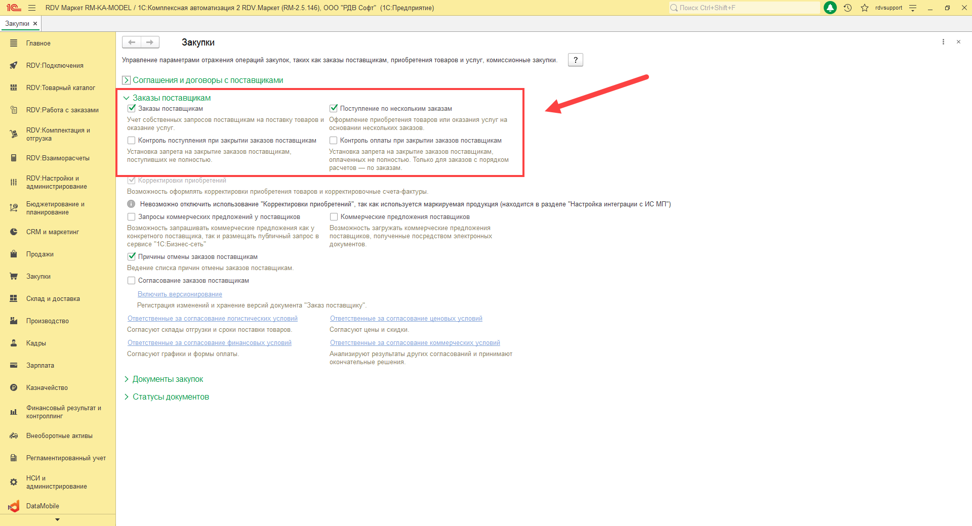 В разделе "Заказы поставщикам" установить флажок "Заказы поставщикам":