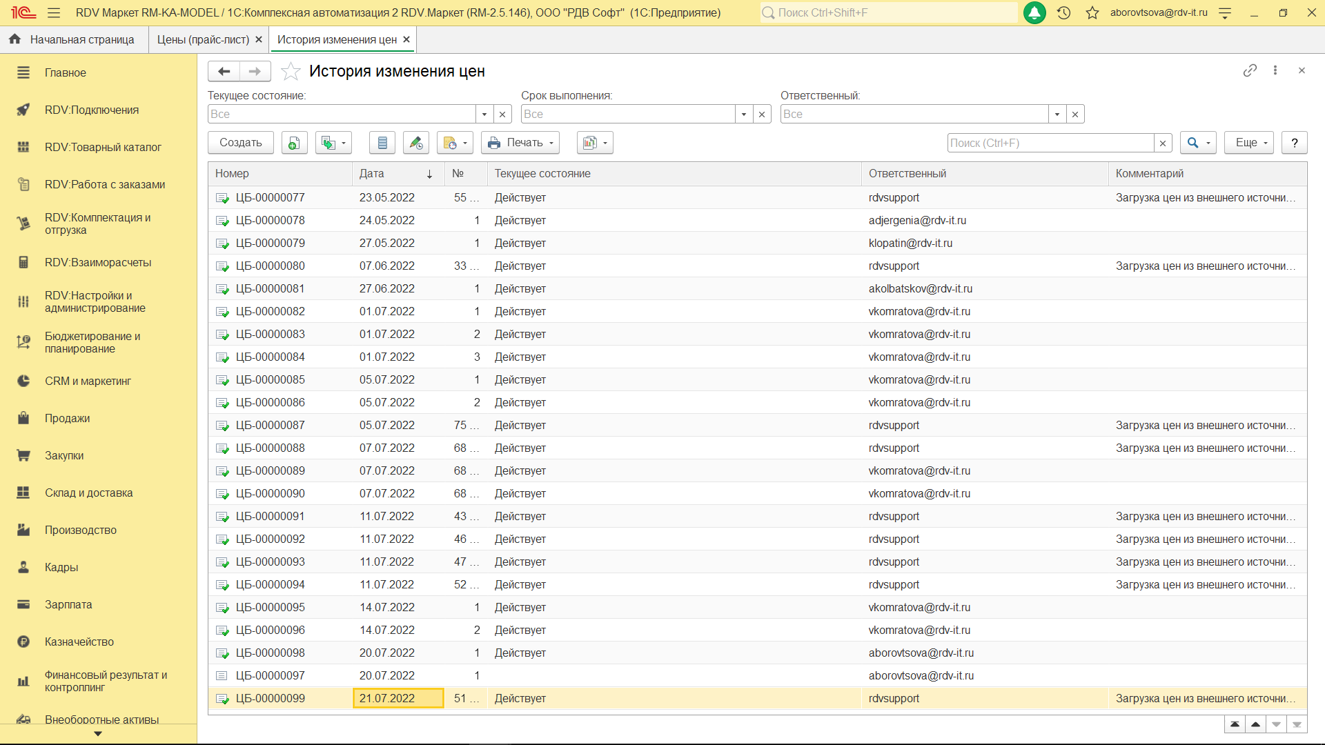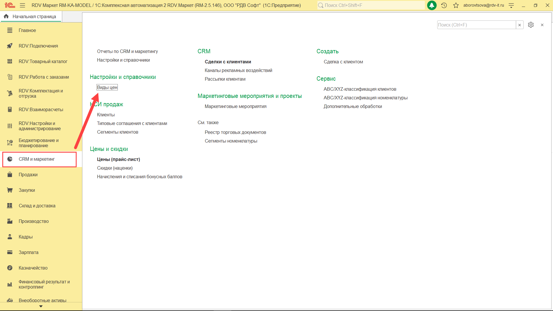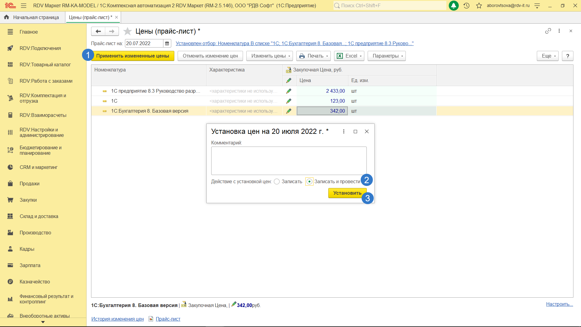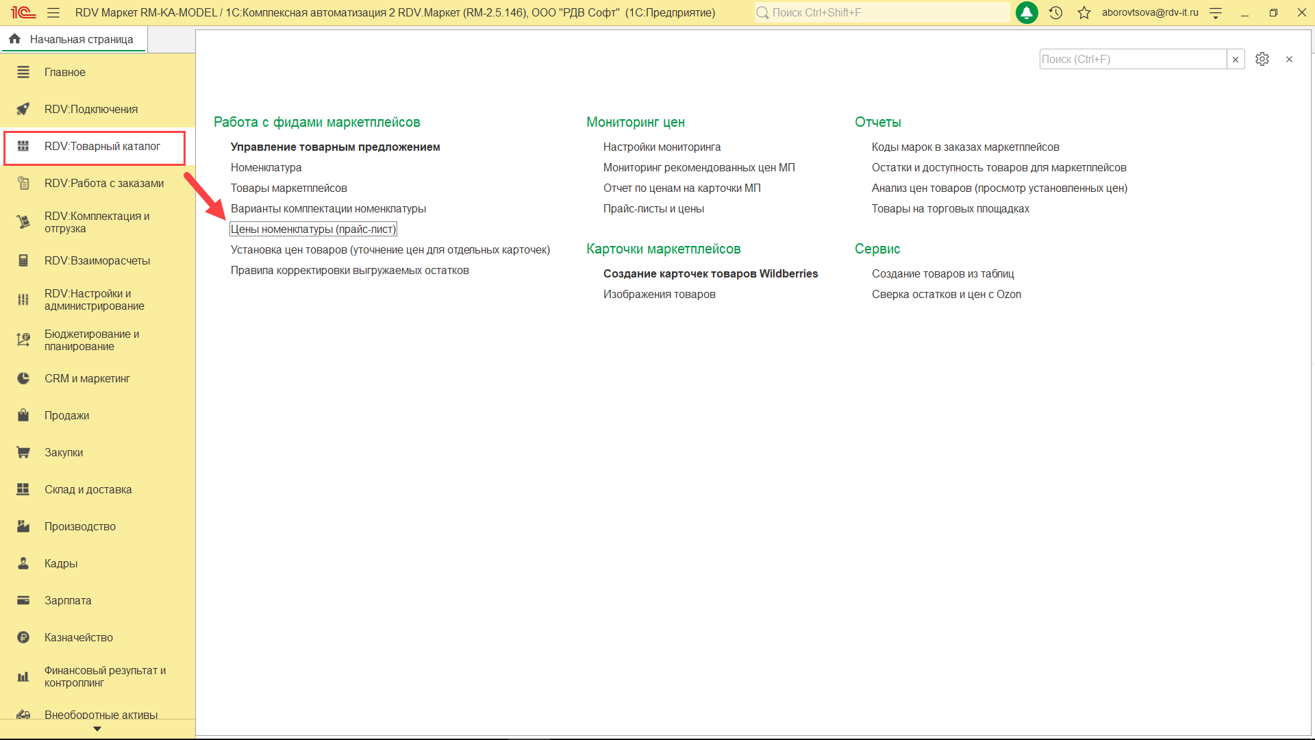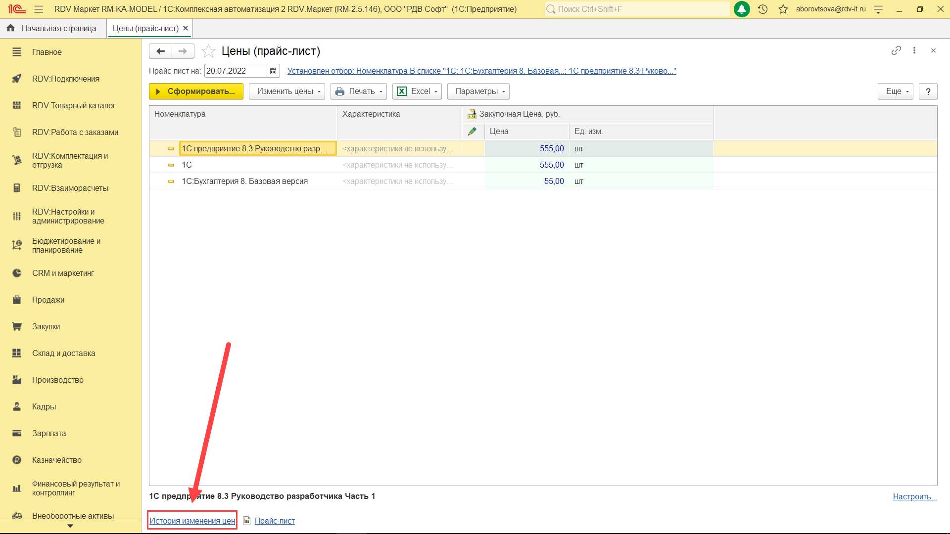 Чтобы просмотреть установленные цены или изменить их, зайдите в раздел "RDV: Товарный каталог" - "Цены номенклатуры (прайс-лист)".