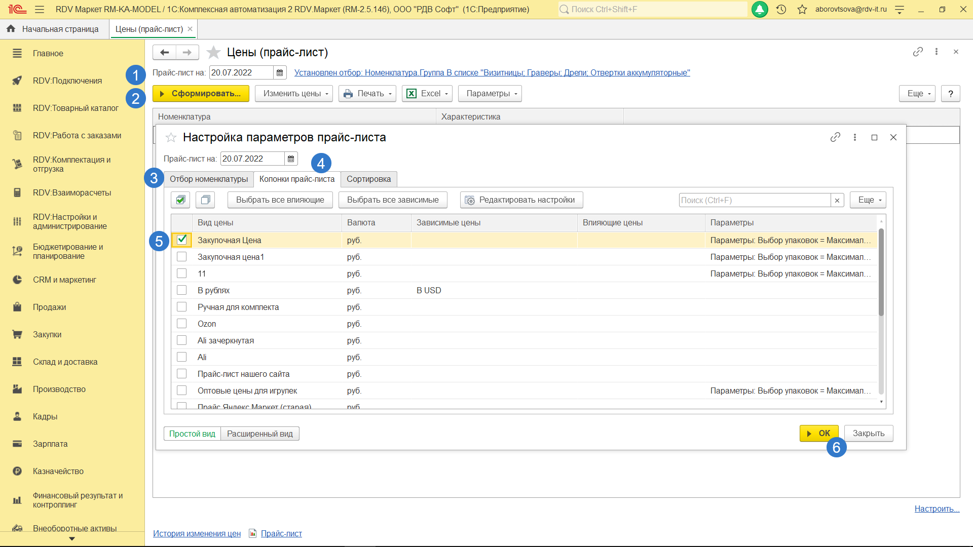 В открывшемся окне выберите интересующие товары в разделе "Отбор номенклатуры" и выберите закупочную цену в разделе "Колонки прайс-листа", нажмите "ОК", чтобы сформировать прайс-лист.