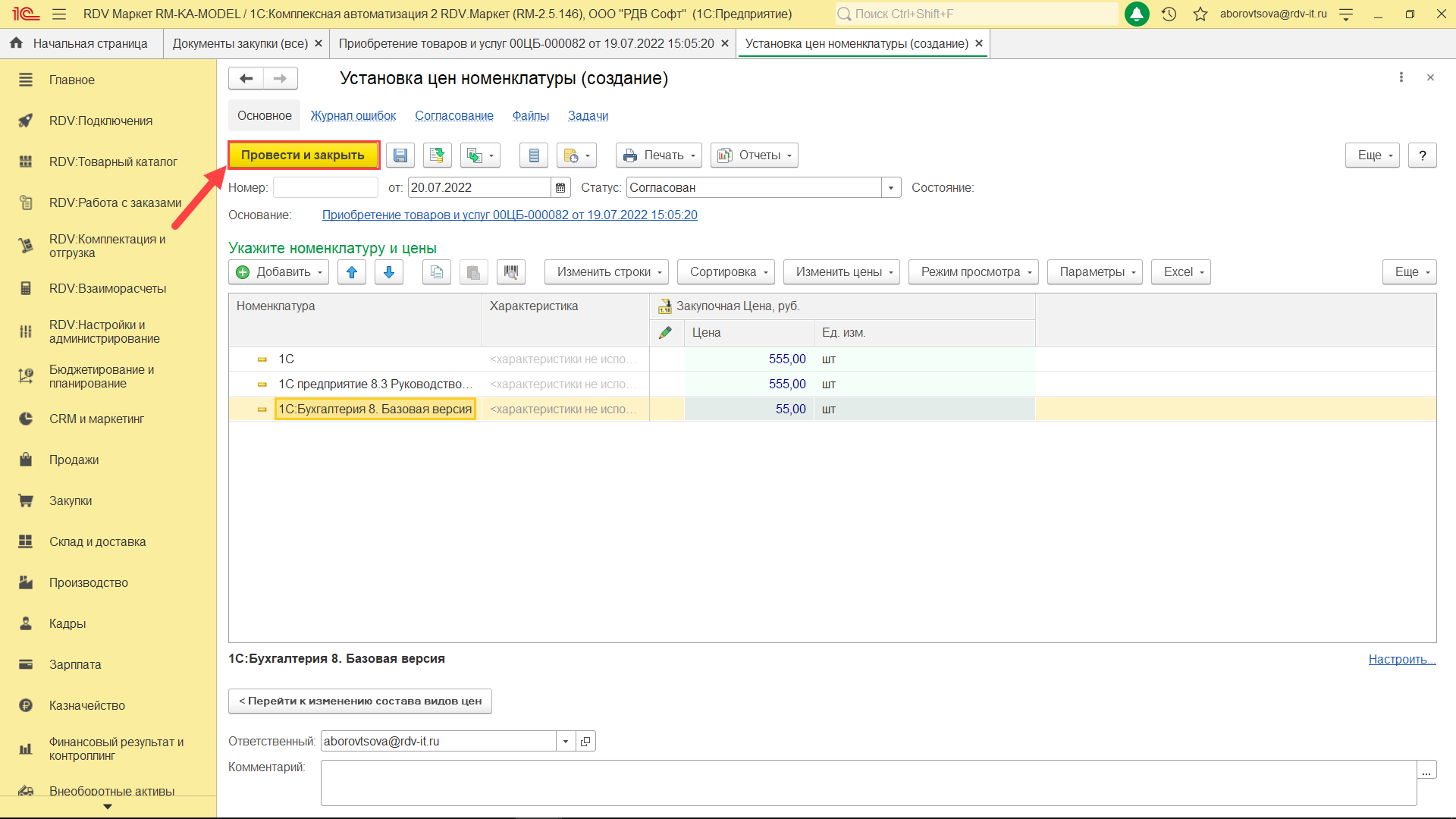В документе "Установка цен номенклатуры" автоматически подставятся закупочный вид цены и цены из документа приобретения. Проведите документ, чтобы установить цены номенклатуры для данного вида цены.