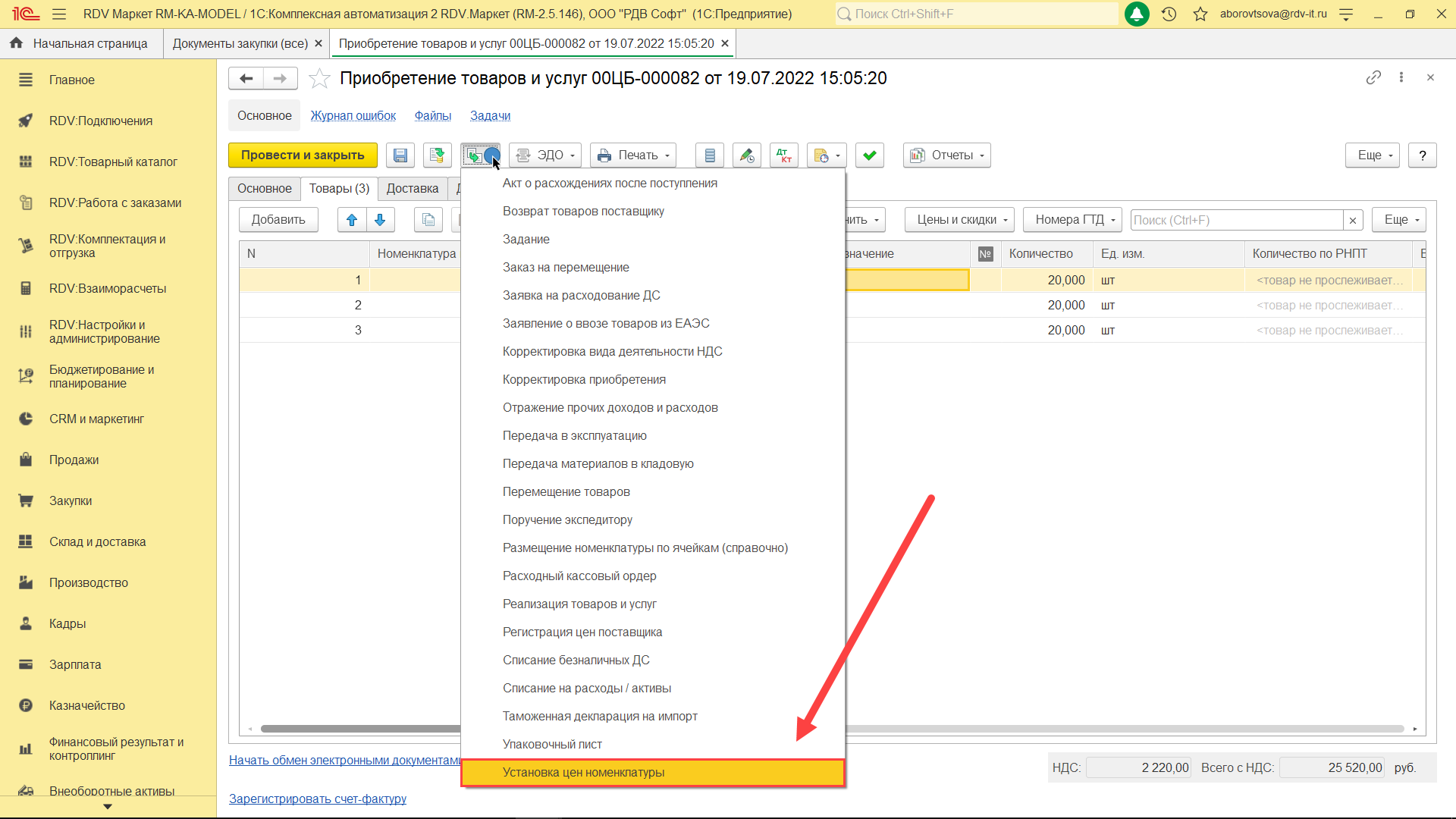 Перейдите в документ приобретения товаров и услуг, который можно найти в разделе "Закупки" - "Документы закупки (все)", и создайте на его основании документ "Установка цен номенклатуры".