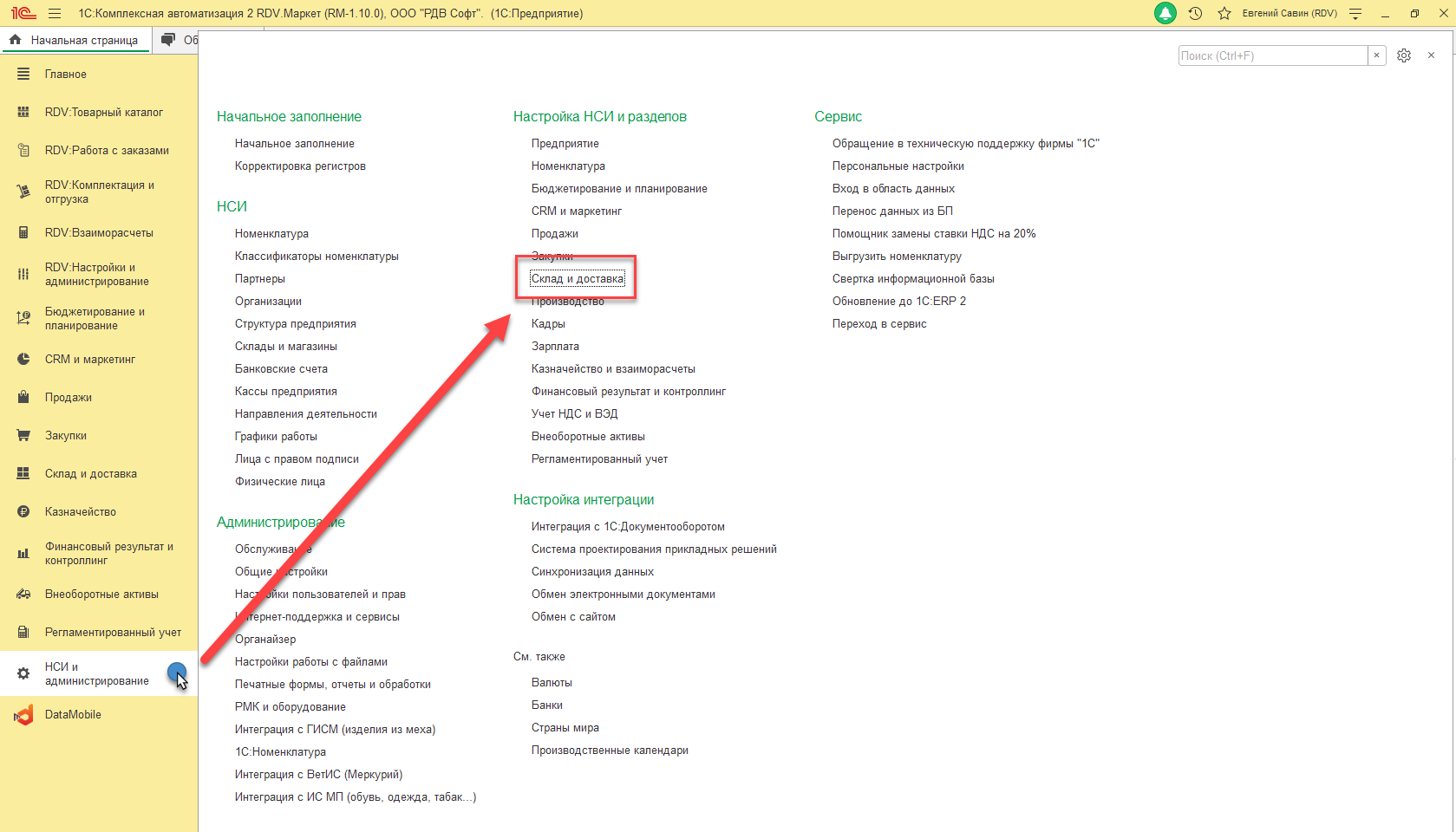 1. Перейти в раздел "Настройки и администрирование" - "Склад и доставка":
