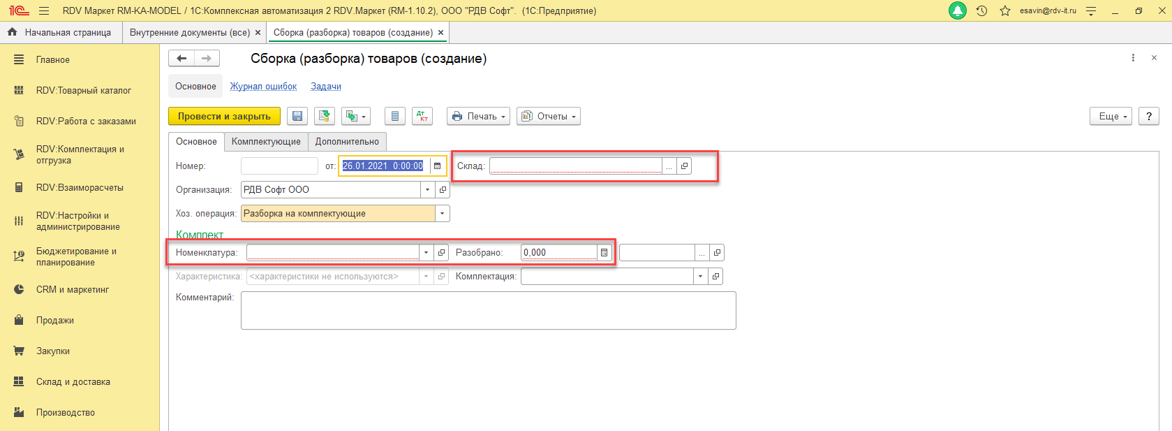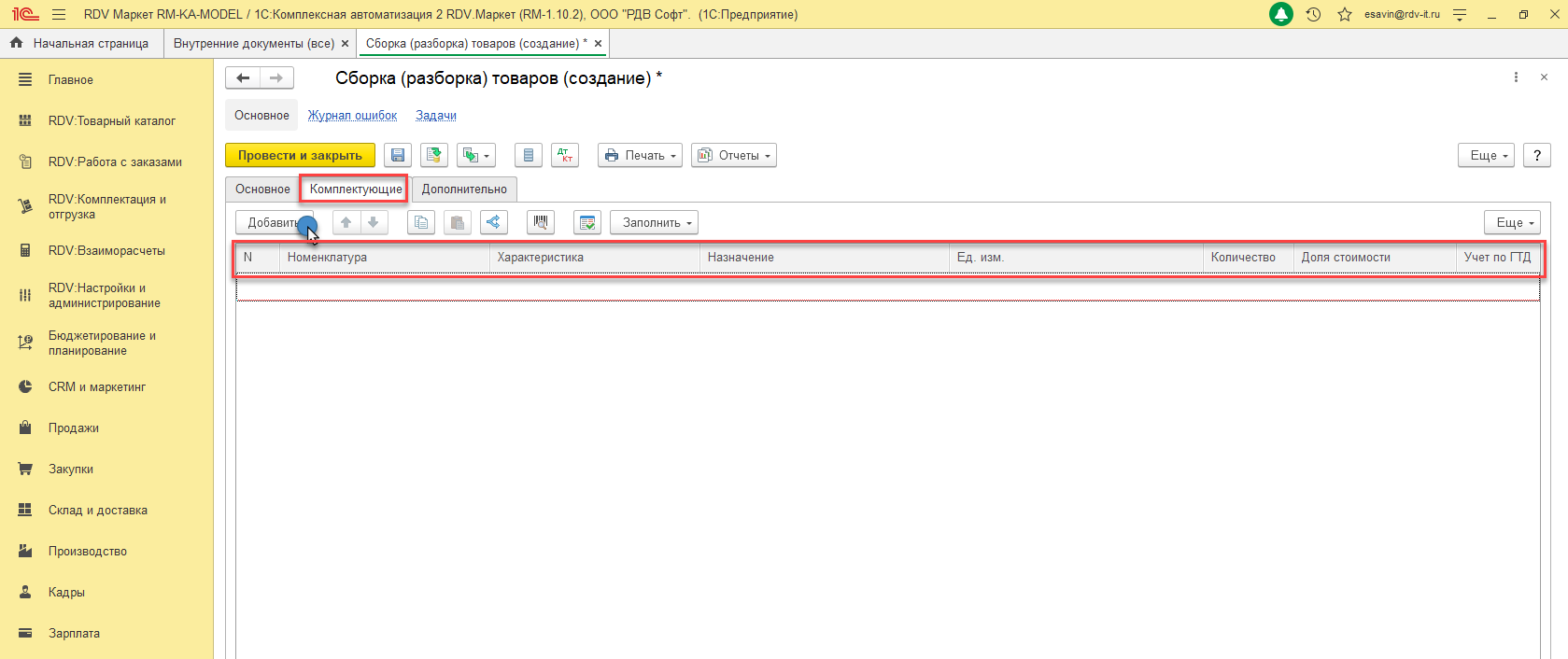 6. Перейти на вкладку "Комплектующие" и через кнопку "Добавить" выбрать комплектующие, из которых/на которые необходимо собрать/разобрать товар. Заполнить все колонки и начать на кнопку "Провести и закрыть":