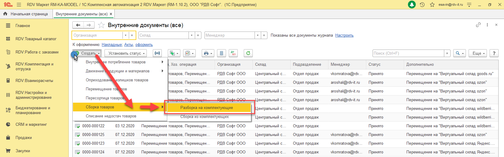 4. Нажать на кнопку "Создать" и выбрать пункт "Сборка из комплектующих"/"Разборка на комплектующие":