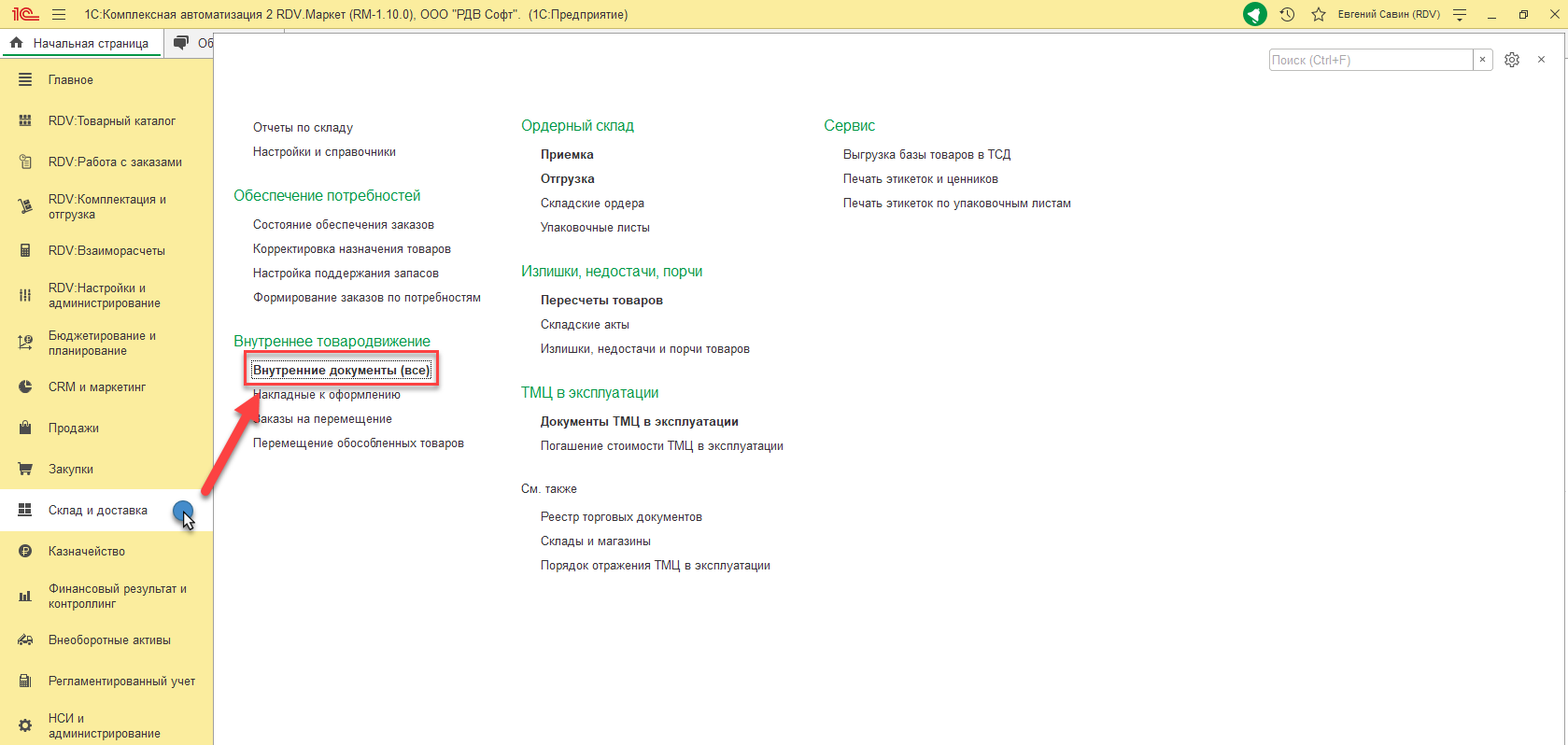3. Перейти в раздел "Склад и доставка" - "Внутренние документы (Все)":