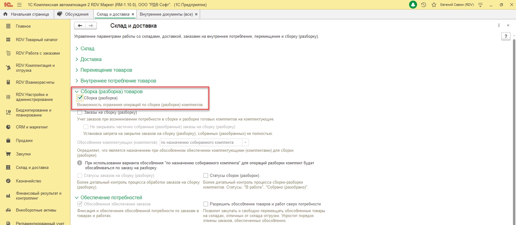 2. Во вкладке "Сборка (разборка) товаров" поставить флаг "Сборка (Разборка)":