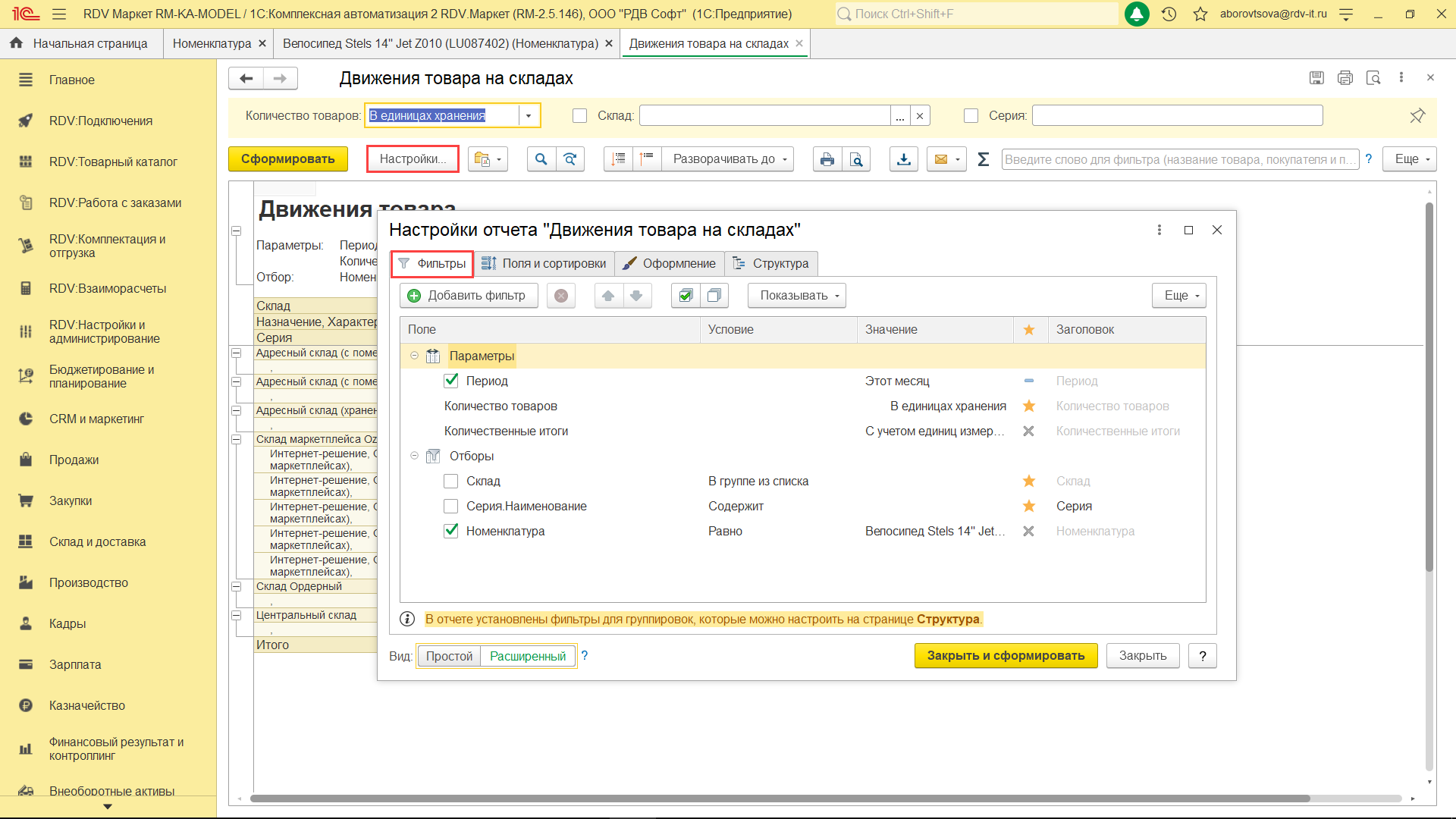 Изначально представлен отбор по складу, серии и количеству товаров в единицах хранения/ отчёта, но, нажав на кнопку "Настройки", на вкладке "Фильтры" (или "Основное", если выбран вид настроек "Простой"), Вы можете задать больше параметров отбора.