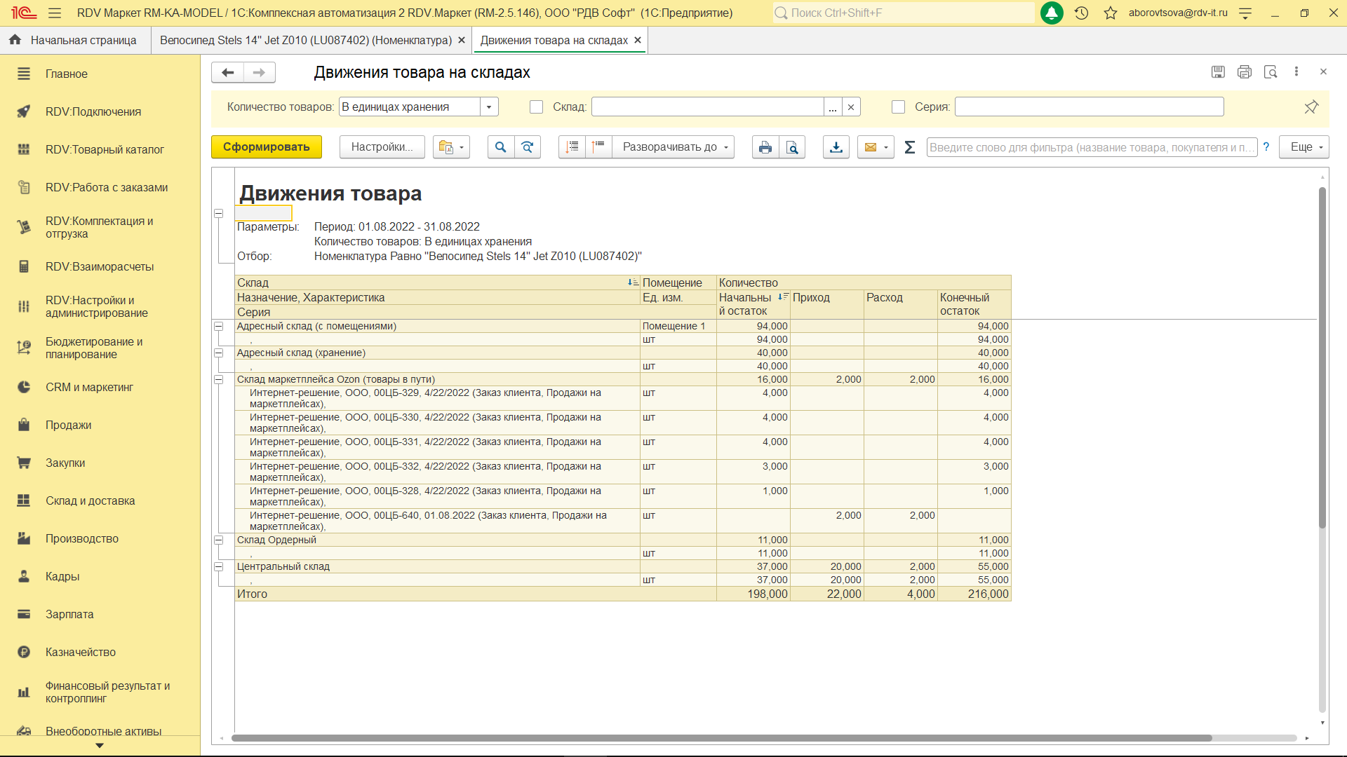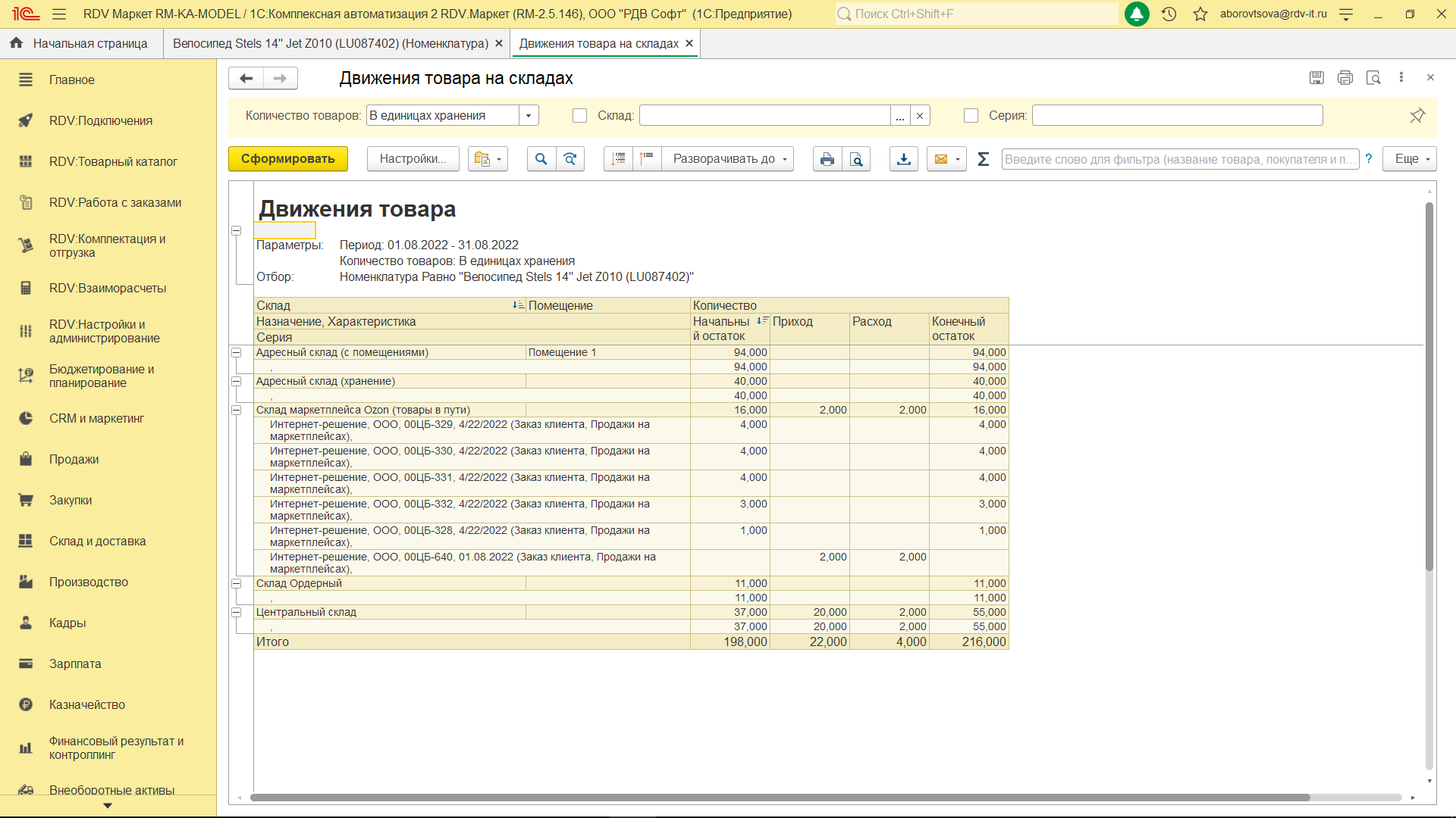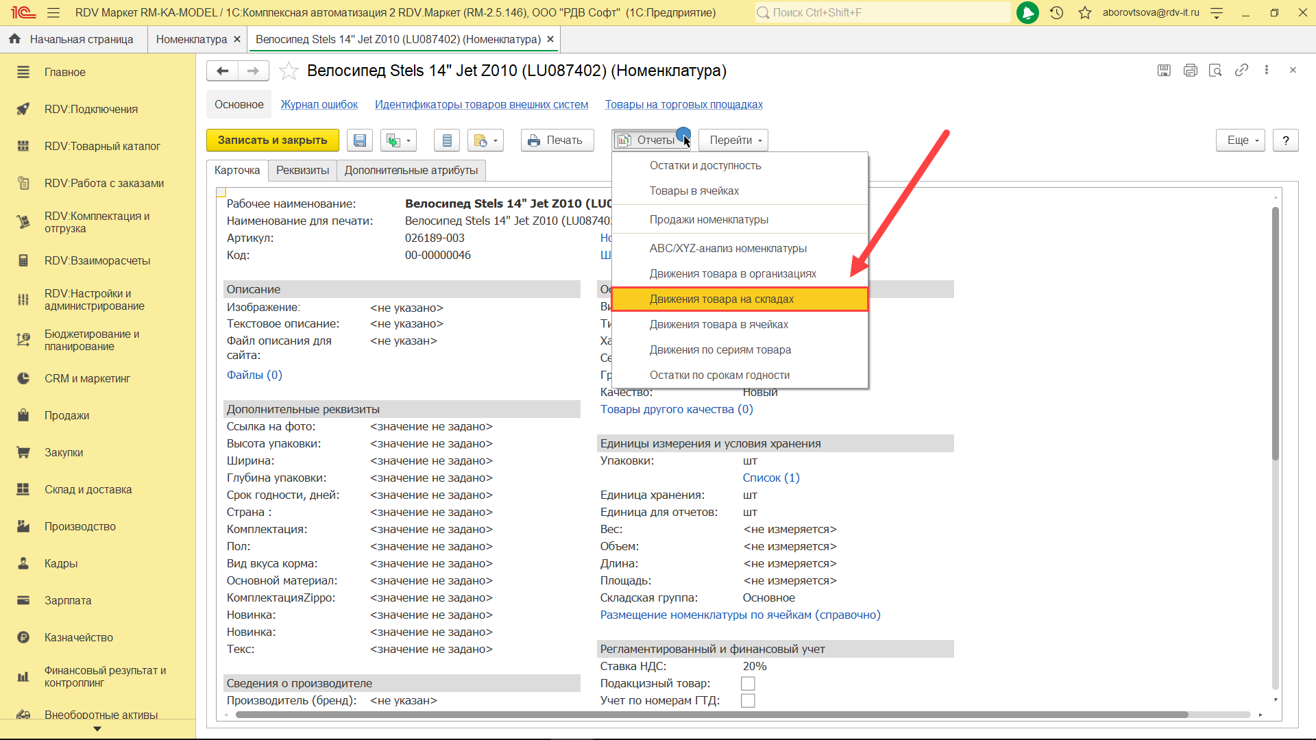 Из карточки номенклатуры можно сформировать отчёт "Движение товара на складах", который показывает движение товара на складе.