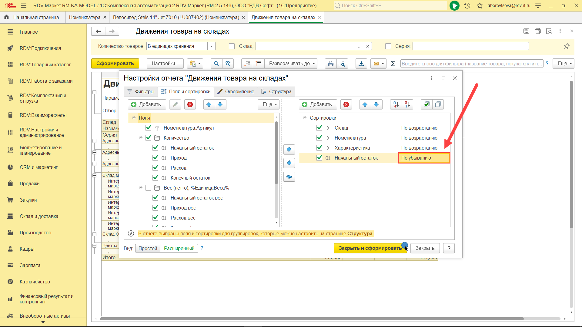 Для примера, отсортируем колонку "Начальный остаток" по убыванию.