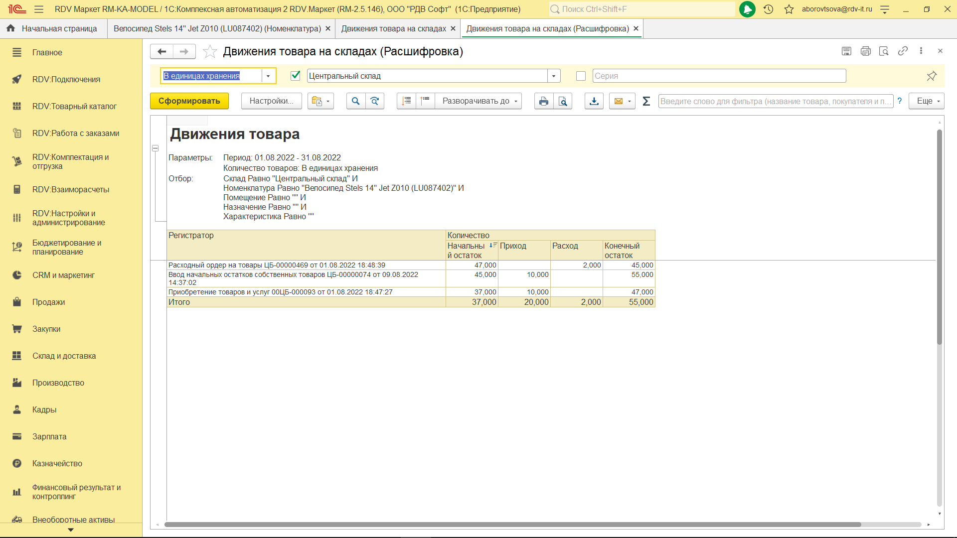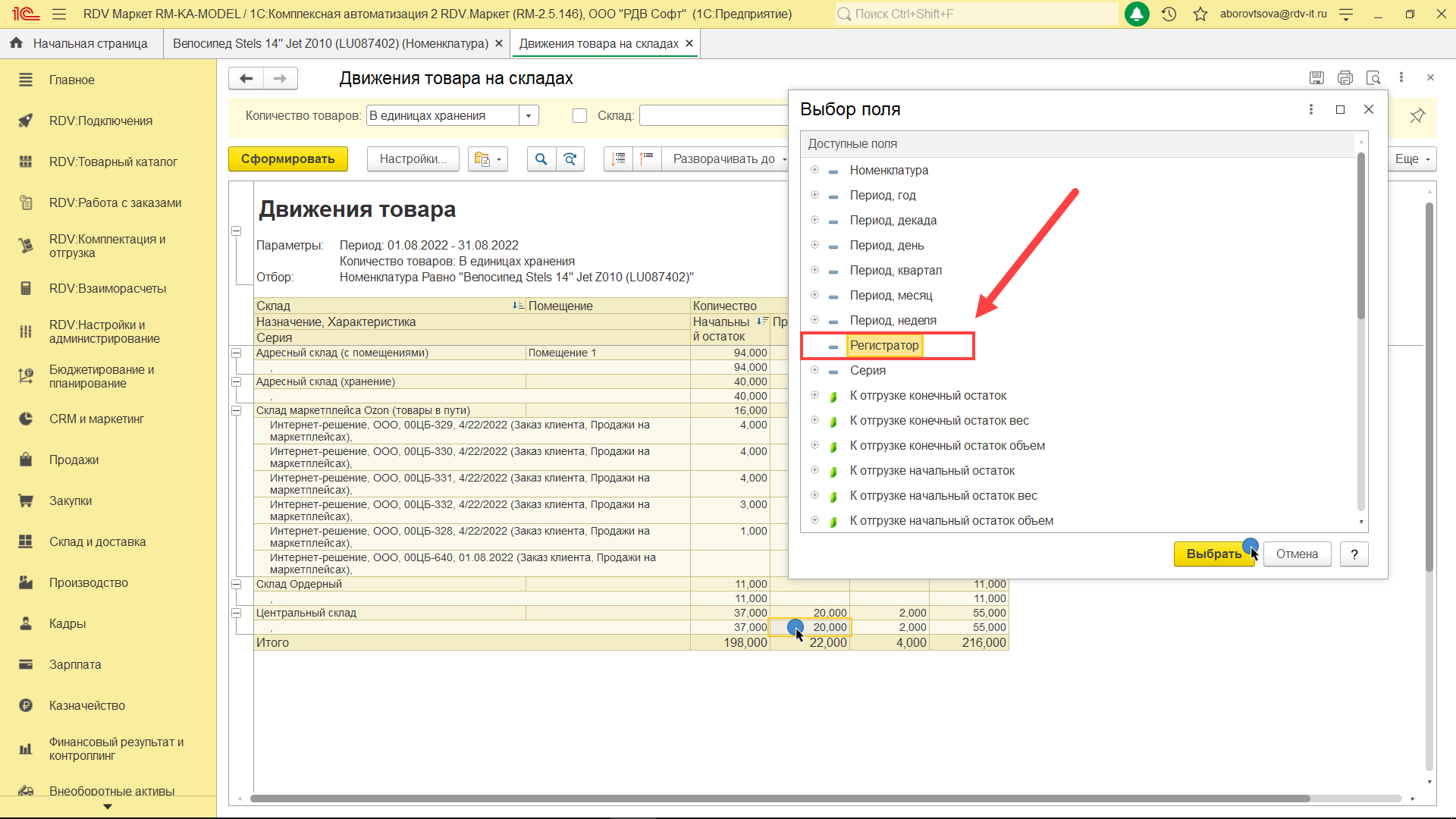 Чтобы узнать, какими документами выполнен приход/ расход товара, можно расшифровать информацию отчётом "Движение товара на складах (Расшифровка)". Для этого дважды нажмите левой кнопкой мыши по колонке прихода или расхода и выберите поле "Регистратор". Сформируется новый отчёт.