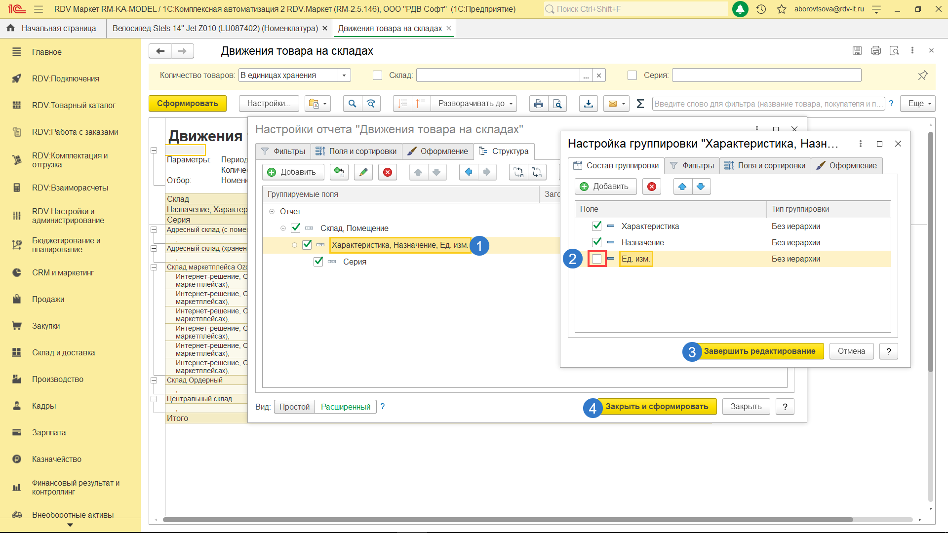 На вкладке "Структура", можно изменять структуру отчёта, добавляя строки с новой информацией через кнопку "Добавить" и/ или установку флага, или изменять подчинённость строк для формирования нужного внешнего вида отчёта.
