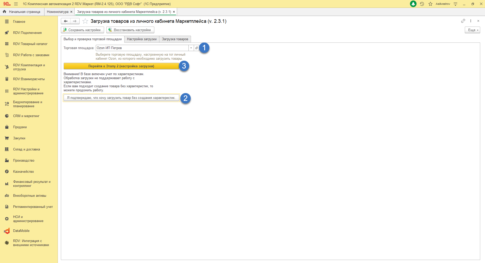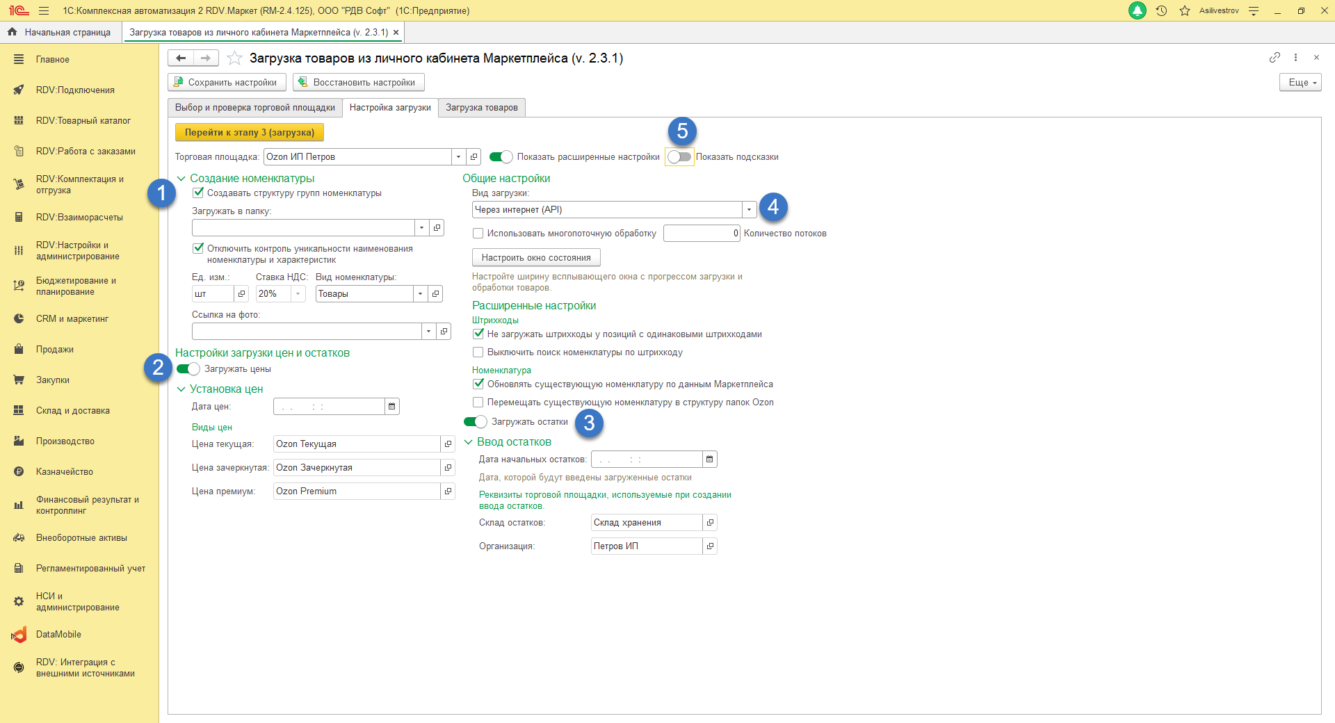 2.2 Загрузка перечня товаров из личного кабинета Озон в 1С