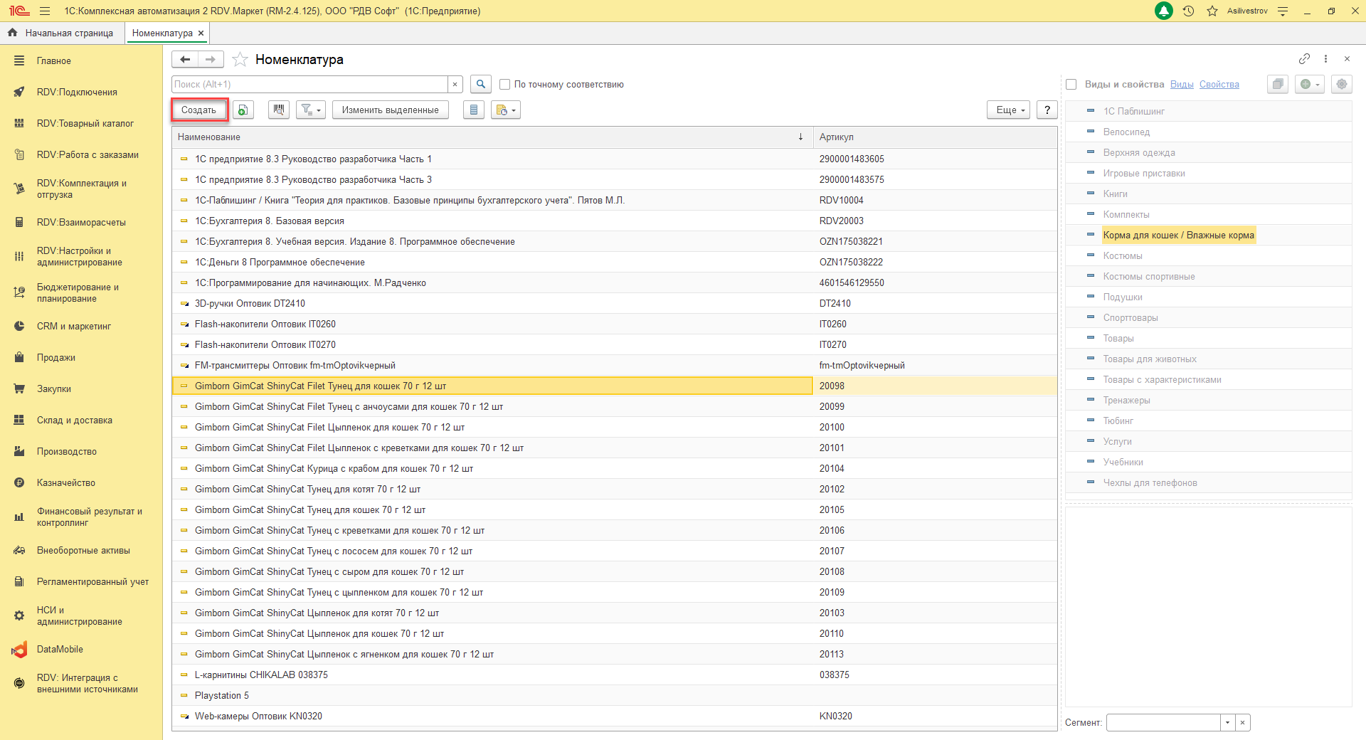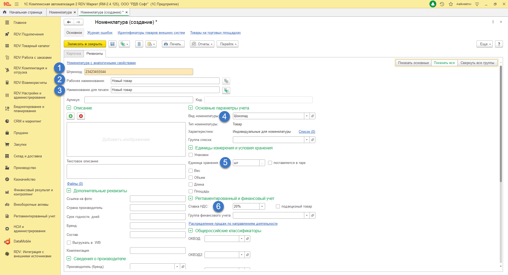 Для создания карточки товара необходимо перейти в раздел "RDV:Товарный каталог" - "Номенклатура":