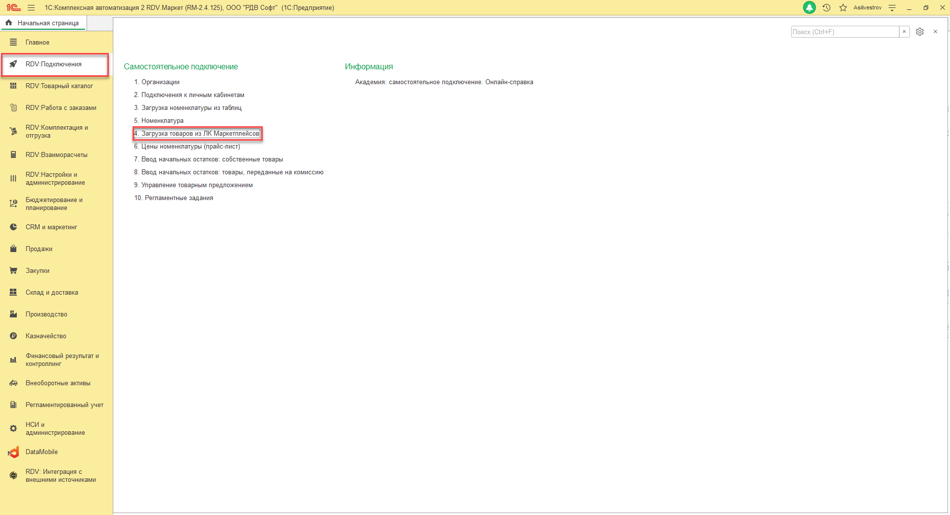 Далее заходим в систему RDV.Маркет и переходим в раздел "RDV: Подключения" - "4. Загрузка товаров из ЛК маркетплейсов".