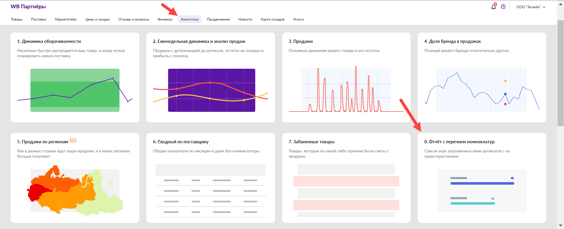Для загрузки номенклатуры WB в RDV маркет сначала необходимо выгрузить из личного кабинета файл с номенклатурой, который находится в разделе "Аналитика" - "8. Отчет с перечнем номенклатур":