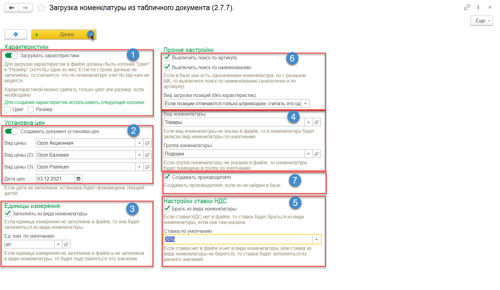 Далее необходимо установить настройки для загрузки номенклатуры.